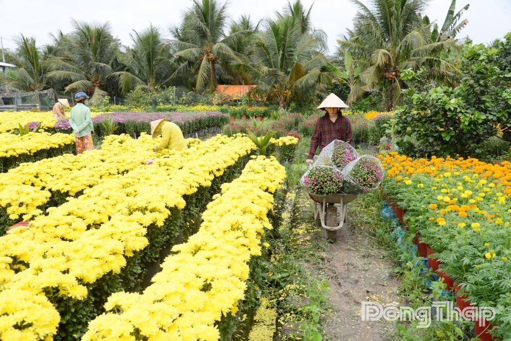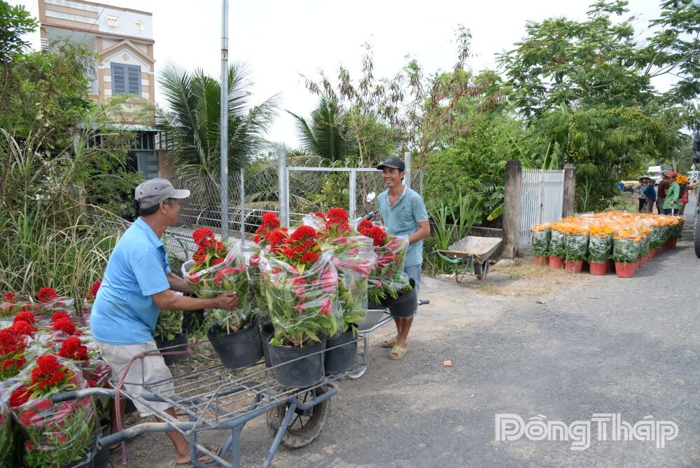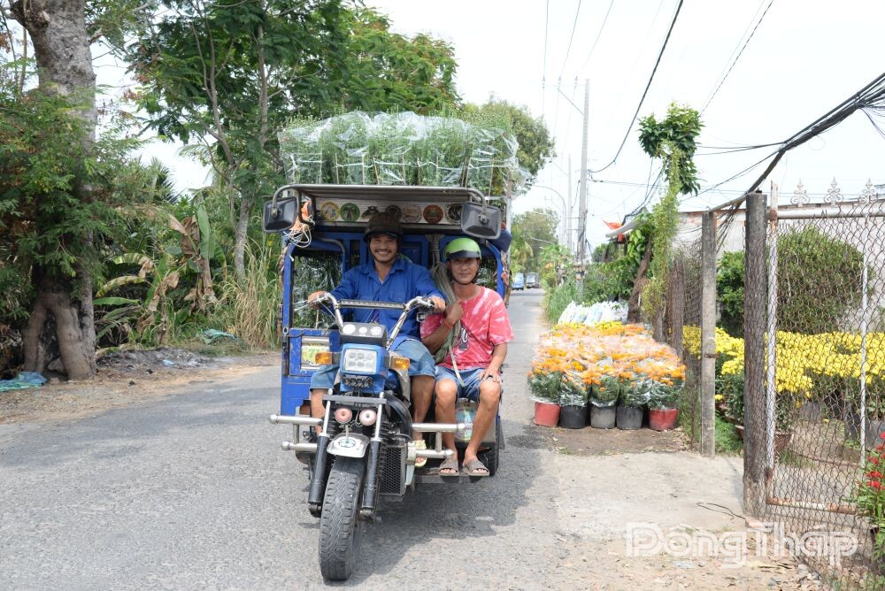 Ghi nhận vào trưa ngày 7-2, nhiều thương lái đã đến nhà vườn tại Làng hoa Mỹ Phong lấy hoa tết đặt trước đó. Lúc chúng tôi đến là bà Đoàn Thị Mười Bông (khu phố Mỹ Hòa, phường Mỹ Phong) đang chở hoa từ ruộng ra đường lớn giao cho thương lái.