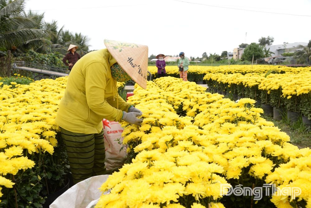 Vụ hoa tết năm nay, gia đình bà Bông trồng 3.000 giỏ cúc Hà Lan, cúc vàng hòe. Đến trưa ngày 7-2, thương lái lấy được 200 giỏ. Số lượng hoa còn lại thương lái cũng đã đặt, chờ đến ngày lấy.