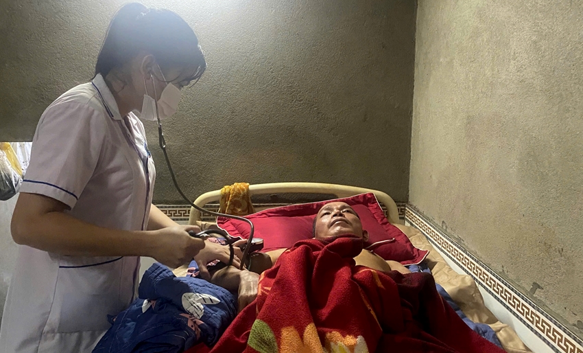 Cán bộ y tế phường An Cựu kiểm tra sức khỏe cho anh Nguyễn Văn Hà sau khi về nhà