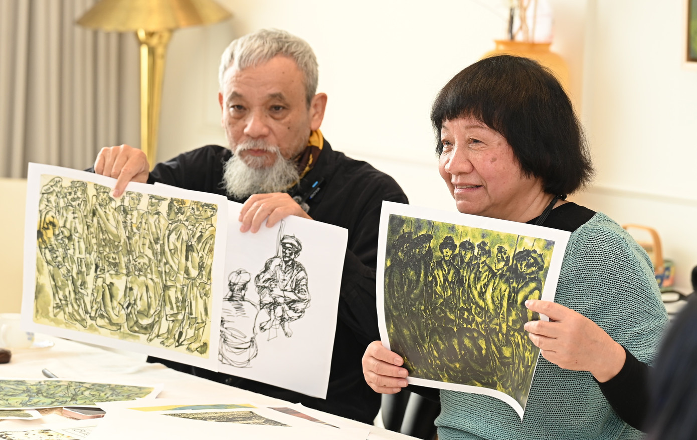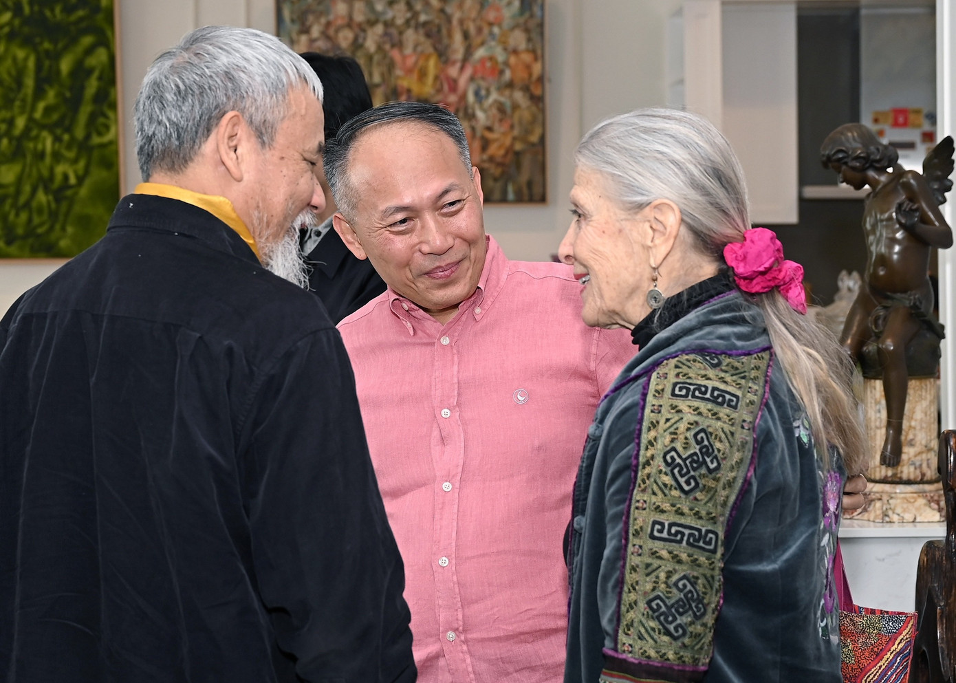 Họa sĩ, nhà nghiên cứu mỹ thuật Phan Cẩm Thượng, họa sĩ Lê Huy Tiếp, ông Võ Điện Biên - con trai Đại tướng Võ Nguyên Giáp, đại diện Bảo tàng Mỹ thuật Việt Nam và hơn 30 nhà sưu tập, giám tuyển trẻ - tham dự buổi trò chuyện nghệ thuật về các tác phẩm của họa sĩ Đặng Thị Khuê được tổ chức tại Hà Nội ngày 22/11.