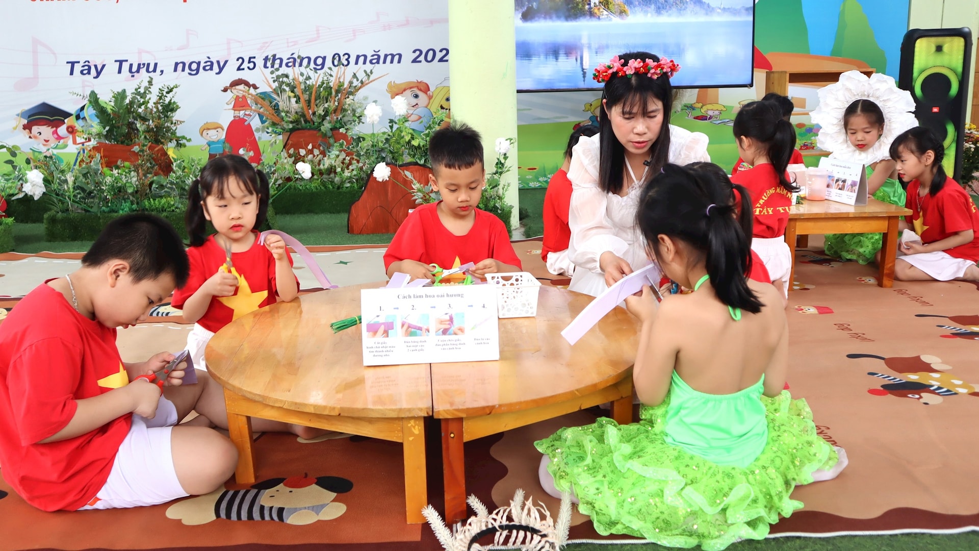 Nổi bật là hoạt động tạo hình “Làm hoa từ các nguyên vật liệu đơn giản” của trẻ lớp mẫu giáo lớn, trong đó tiếng Anh được lồng ghép khéo léo thông qua một câu chuyện gắn với làng hoa Tây Tựu, tạo hứng thú và giúp trẻ tiếp cận ngôn ngữ một cách tự nhiên.