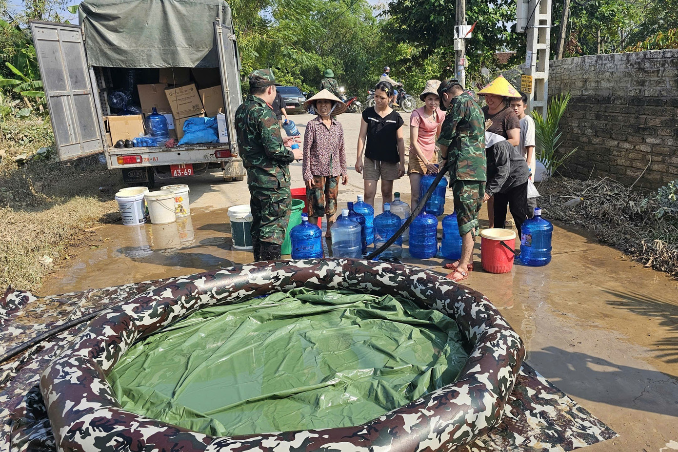 Đến điểm đặt trạm lọc nước quân sự từ sớm để lấy nước sạch, chị Phạm Thị Cúc - người dân ở phường Quan Triều, cho biết nhà chị bị ngập sâu hơn 2m trong đợt mưa lũ sau hoàn lưu bão số 11. Trong thời gian bị cô lập, gia đình chị nhận được tiếp tế lương thực và nước đóng chai từ Ban Chỉ huy quân sự phường Quan Triều.