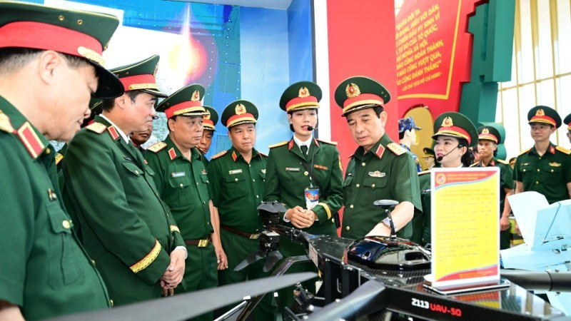 Bộ trưởng Quốc phòng Phan Văn Giang thăm gian hàng trưng bày UAV do Nhà máy Z113 sản xuất. ảnh: nguyễn minh