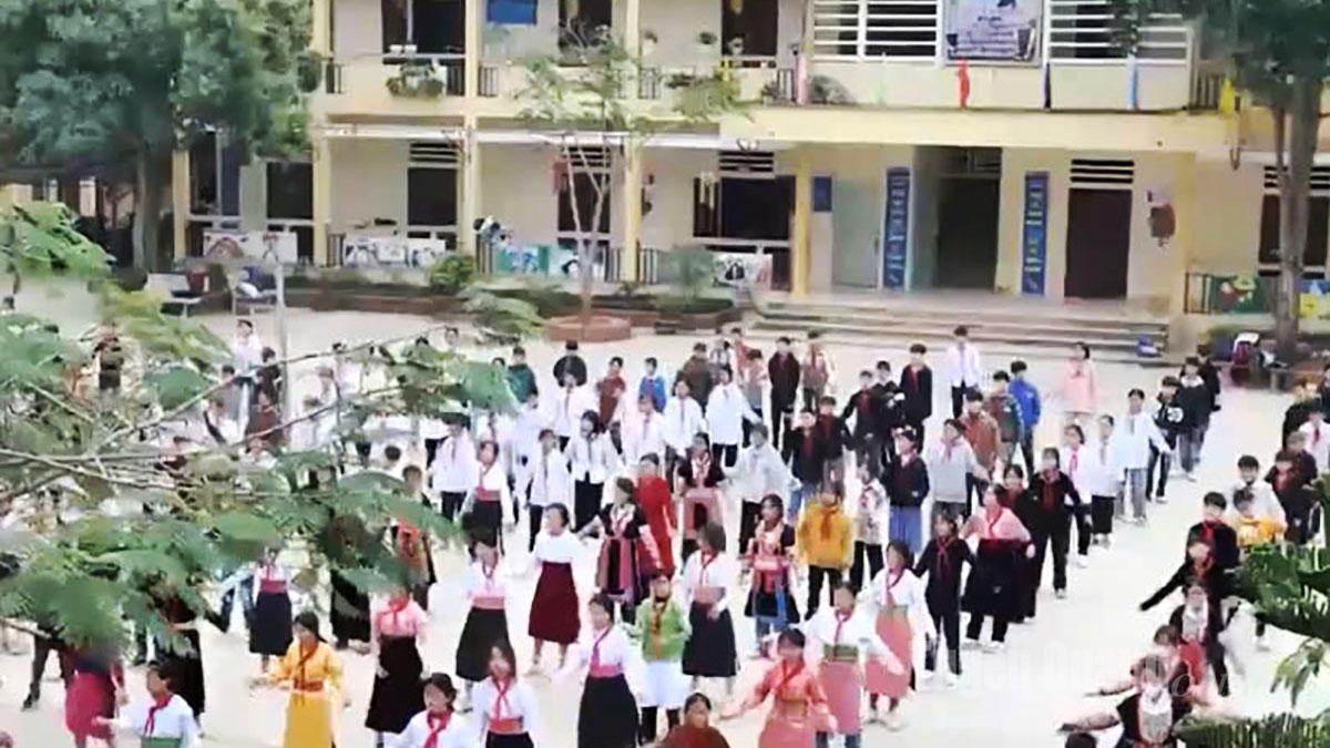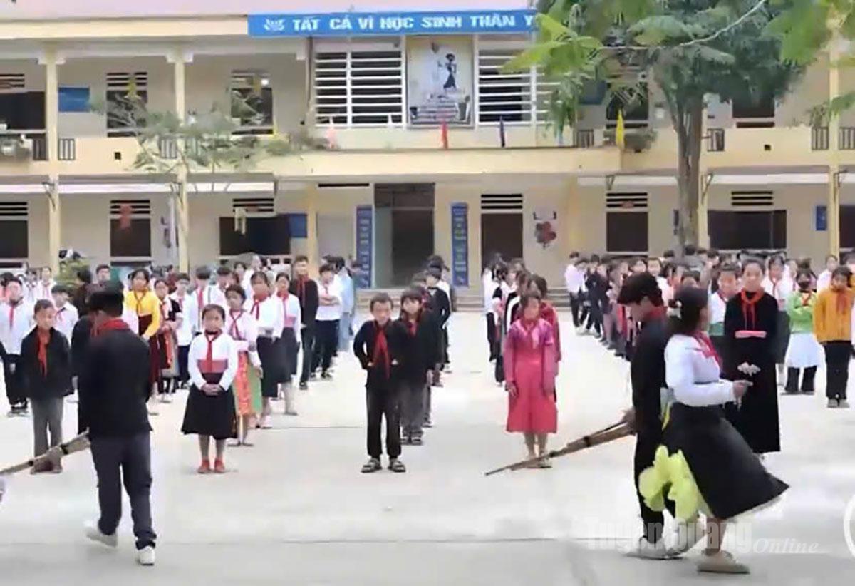 Học sinh một số trường học trên địa bàn tỉnh được hướng dẫn điệu múa khèn Mông trong hoạt động giữa giờ.