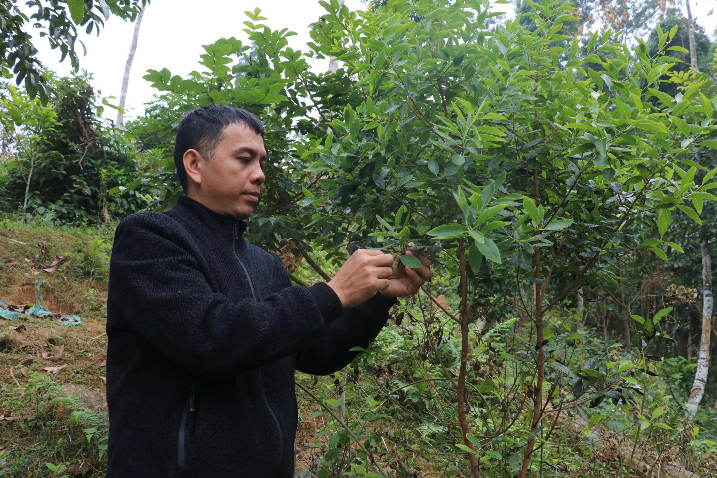 Anh Luân Văn Nông thu hoạch lá đàn hương để chế biến trà đàn hương