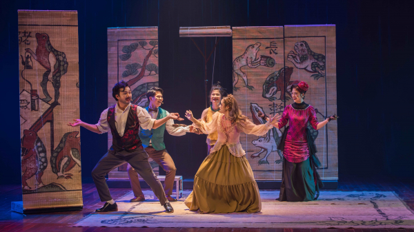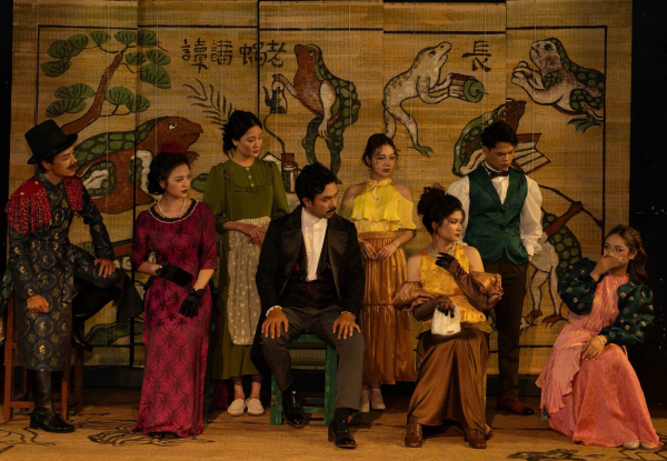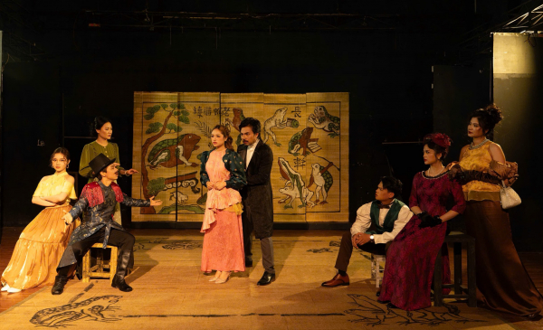 Thiết kế sân khấu với những tấm mành tre với hình ảnh mang đậm màu sắc văn hóa Việt trong vở Pygmalion.