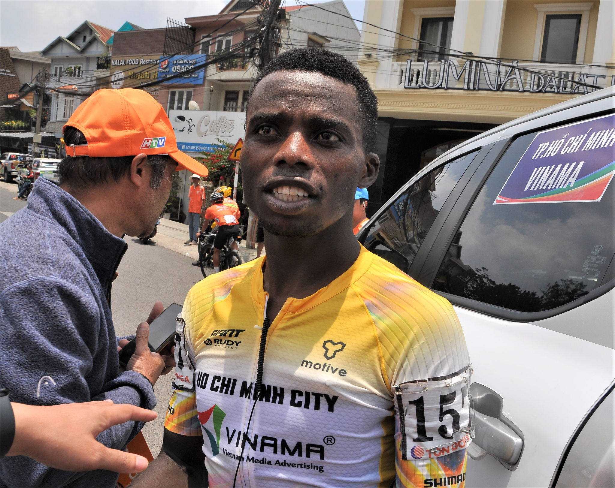 Tay đua về nhì trong chặng đua này là Mugisha Moise (mang áo thi đấu số 157) của đội Thành phố Hồ Chí Minh Vinama.