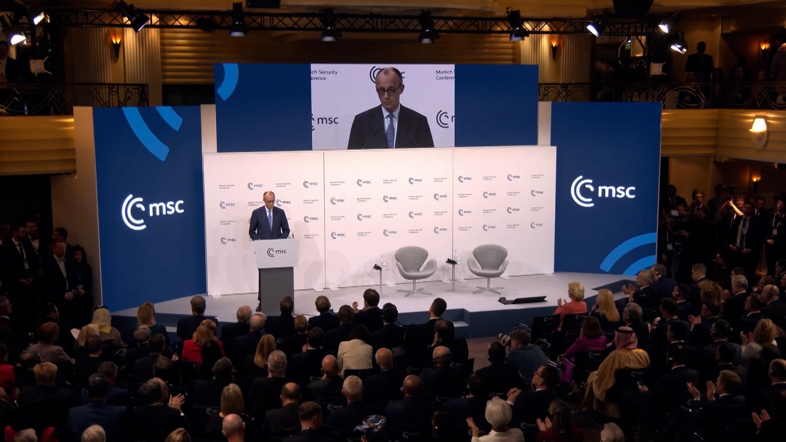 Bên cạnh đó, người đứng đầu Chính phủ Đức nhấn mạnh việc tiến hành các cuộc đối thoại với Pháp và có thể cả Anh là điều cần thiết nhằm làm rõ cách thức tăng cường năng lực răn đe hạt nhân ở châu Âu. Ông cho biết có thể tính đến phương án sử dụng máy bay của lực lượng vũ trang Đức để phục vụ việc triển khai bom hạt nhân của Pháp hoặc Anh. Đối với vũ khí hạt nhân của Mỹ, các máy bay chiến đấu Tornado hiện đã được bố trí tại căn cứ không quân Büchel ở vùng Eifel để thực hiện nhiệm vụ này.