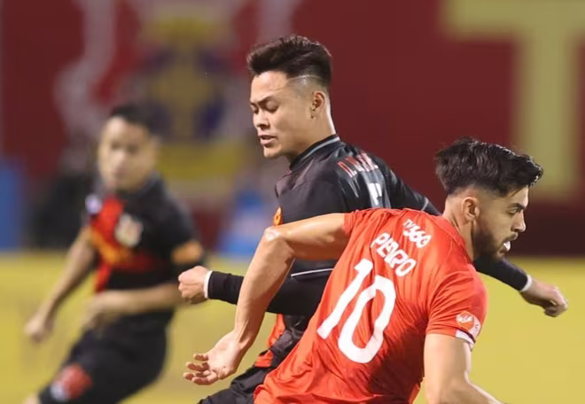 Đức Chiến (áo đen) trong màn đối đầu CLB cũ Thể Công Viettel