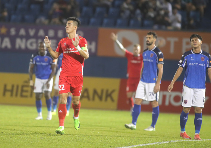 Tiến Linh chắp tay xin lỗi vì ghi bàn vào lưới CLB Becamex TP.HCM. Ảnh: CLB CA TP.HCM