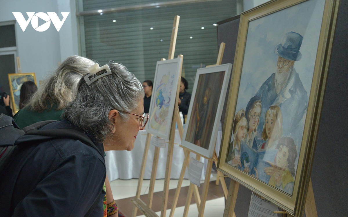 Khách nước ngoài ngắm các bức họa của sinh viên mỹ thuật Việt Nam về chủ đề “Hàn gắn thế giới” nhân lễ tưởng niệm Holocaust. Ảnh: Trung Hiếu.