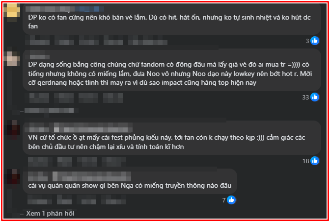 Tuy nhiên, sau thông báo này, trên mạng xã hội xuất hiện một bài đăng nghi vấn về lý do thực sự khiến đêm mini show không thể diễn ra. Theo bài đăng này, tình trạng bán vé chậm là nguyên nhân chính. Hình ảnh được chụp trên một nền tảng phân phối vé cho thấy nhiều hạng vé từ 700.000 đến 2,5 triệu đồng vẫn chưa bán hết dù chương trình đã mở bán từ một tháng trước.
