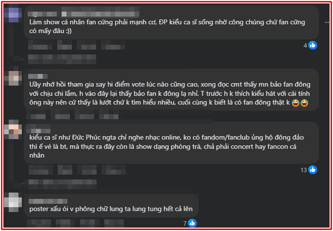 Trên mạng xã hội, nhiều khán giả bày tỏ quan điểm xung quanh việc mini show của Đức Phúc hoãn. Một số ý kiến nhận định nam ca sĩ chủ yếu dựa vào công chúng mà thiếu một fandom mạnh, nên việc bán vé gặp khó khăn, đặc biệt khi chương trình là dạng phòng trà chứ không phải concert lớn. Nhiều người cho rằng mặc dù Đức Phúc có hit và hát live tốt, nhưng chưa xây dựng được cộng đồng fan cứng ủng hộ đều đặn, dẫn đến tình trạng vé ế.