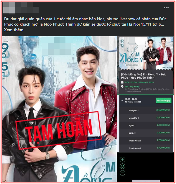 Tối 13/11, Đức Phúc đăng tải một bài viết dài trên trang cá nhân, thông báo về việc dời lịch mini show cá nhân tại Hà Nội sang năm 2026. Đêm nhạc ban đầu dự kiến diễn ra vào ngày 15/11, với sự góp mặt của ca sĩ khách mời Noo Phước Thịnh.