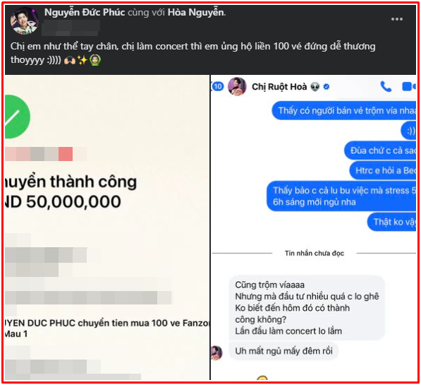 Theo đó, trên trang cá nhân, Đức Phúc đăng tải ảnh chụp màn hình cuộc trò chuyện với Hòa Minzy xoay quanh việc tổ chức fan concert. Trong đoạn tin nhắn, nữ ca sĩ cho biết tình hình bán vé hiện tại khá khả quan, tuy nhiên điều khiến cô lo lắng chính là mức đầu tư lớn cho chương trình lần này. Là một trong những nữ ca sĩ được yêu mến bởi hình ảnh gần gũi, chân thành, Hòa Minzy không giấu được sự hồi hộp khi lần đầu tiên đứng ra thực hiện một concert mang dấu ấn cá nhân.