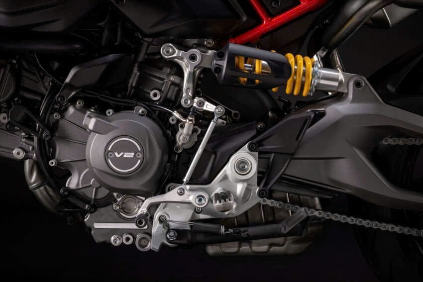 Ducati Hypermotard V2 2026 được trang bị động cơ V-twin 890cc, tương tự các mẫu Panigale V2, Streetfighter V2 và Monster, nhưng được tinh chỉnh để mang lại công suất 120 mã lực tại 10.750 vòng/phút cùng mô-men xoắn cực đại 94 Nm tại 8.250 vòng/phút. Điểm đáng chú ý là Ducati đã loại bỏ hệ thống van Desmodromic truyền thống, giúp giảm chi phí và tần suất bảo dưỡng, với chu kỳ điều chỉnh khe hở xupap kéo dài tới 45.000 km.