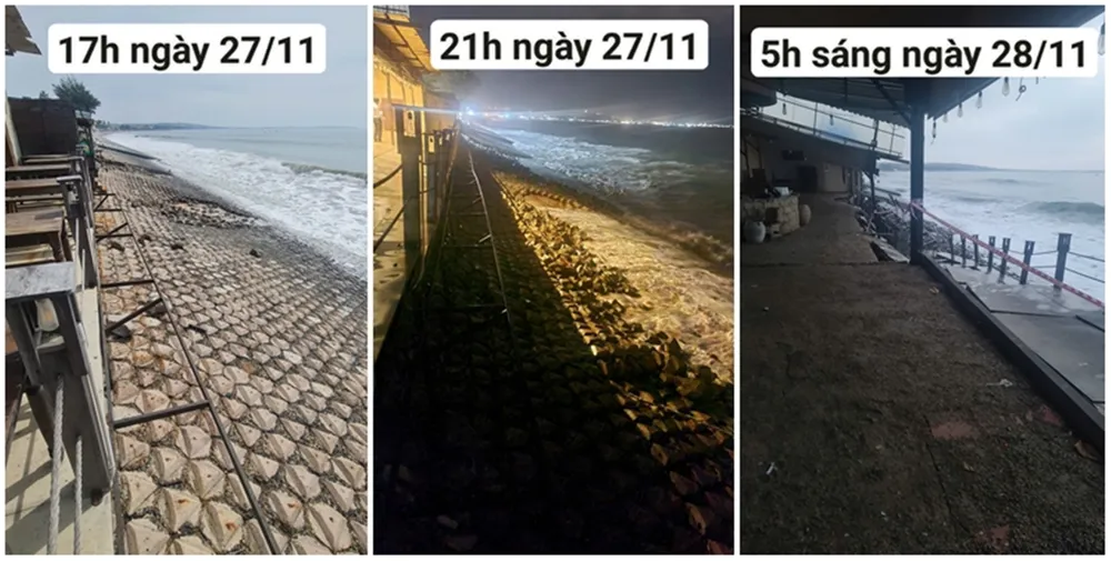 Ảnh chụp tại một địa điểm từ 17h ngày 27-11 đến 5h ngày 28-11, sóng biển đã đánh hư hỏng nghiêm trọng hệ thống bờ kè.