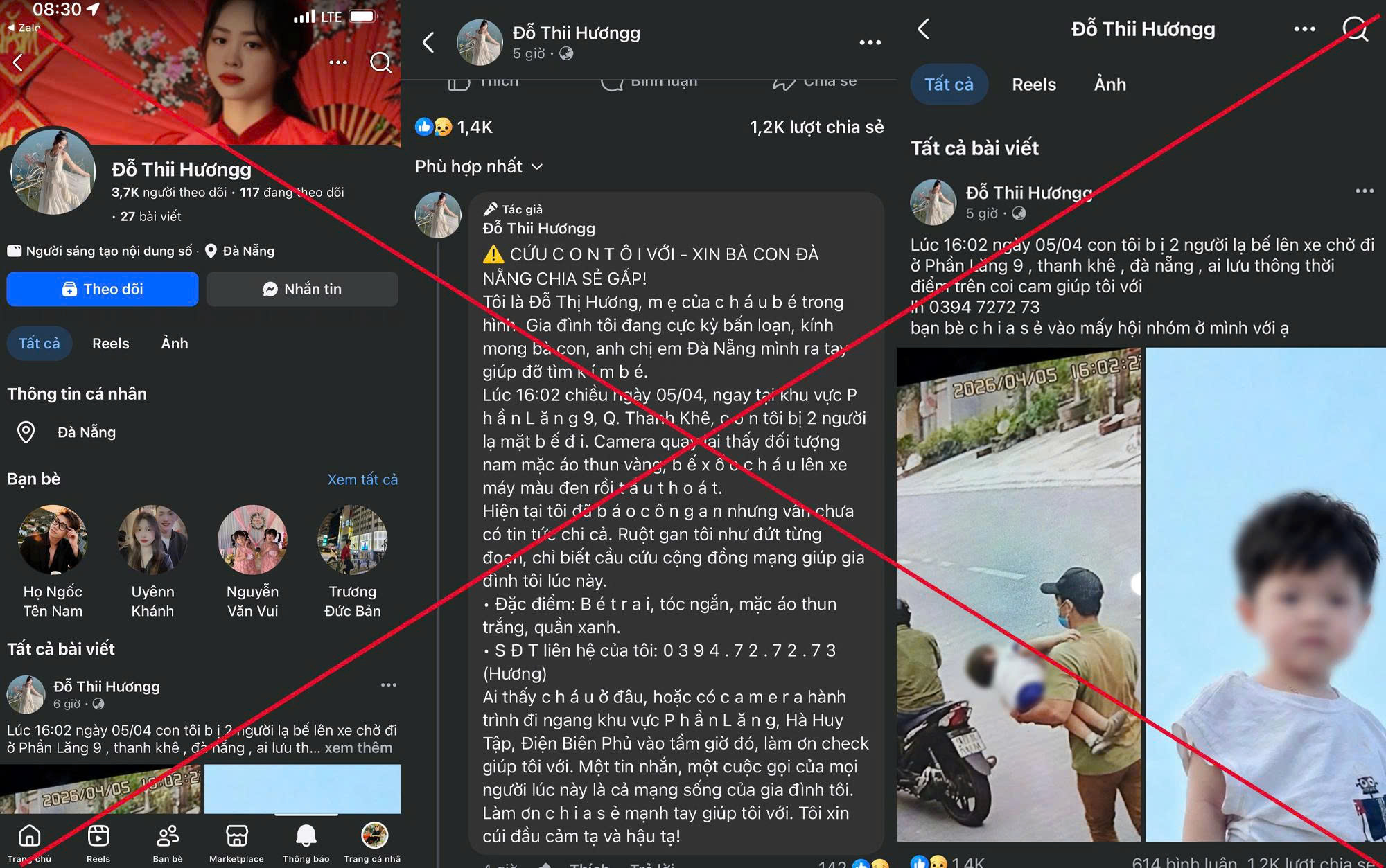 Thông tin bắt cóc trẻ em do tài khoản Đỗ Thii Hươngg chia sẻ là hoàn toàn bịa đặt. (Ảnh: C.A)
