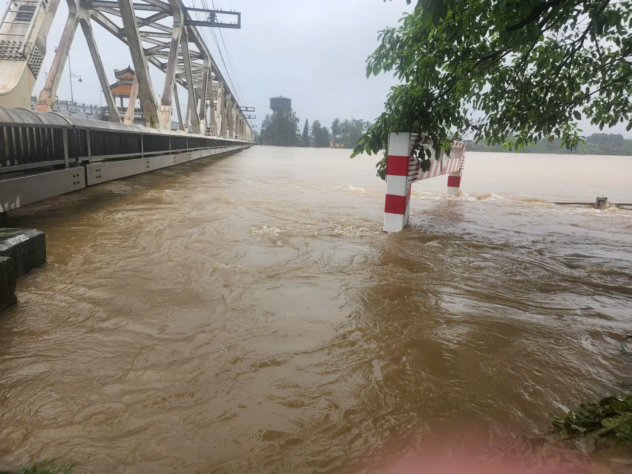 Nước đang lên và đã chạm đáy dầm cầu Bạch Hổ, Giả Viên (TP Huế).