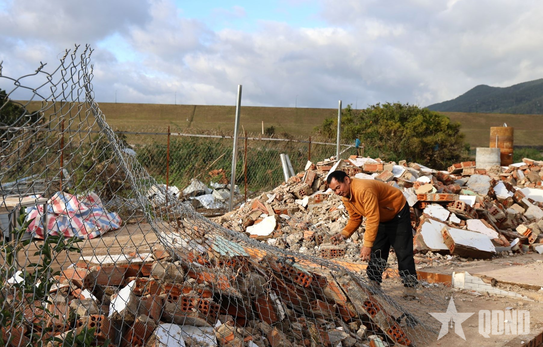 Anh Trần Đình Hiếu ở thôn Quảng Lạc, xã D'ran trên nền căn nhà chỉ còn đống gạch vụn sau cơn lũ.