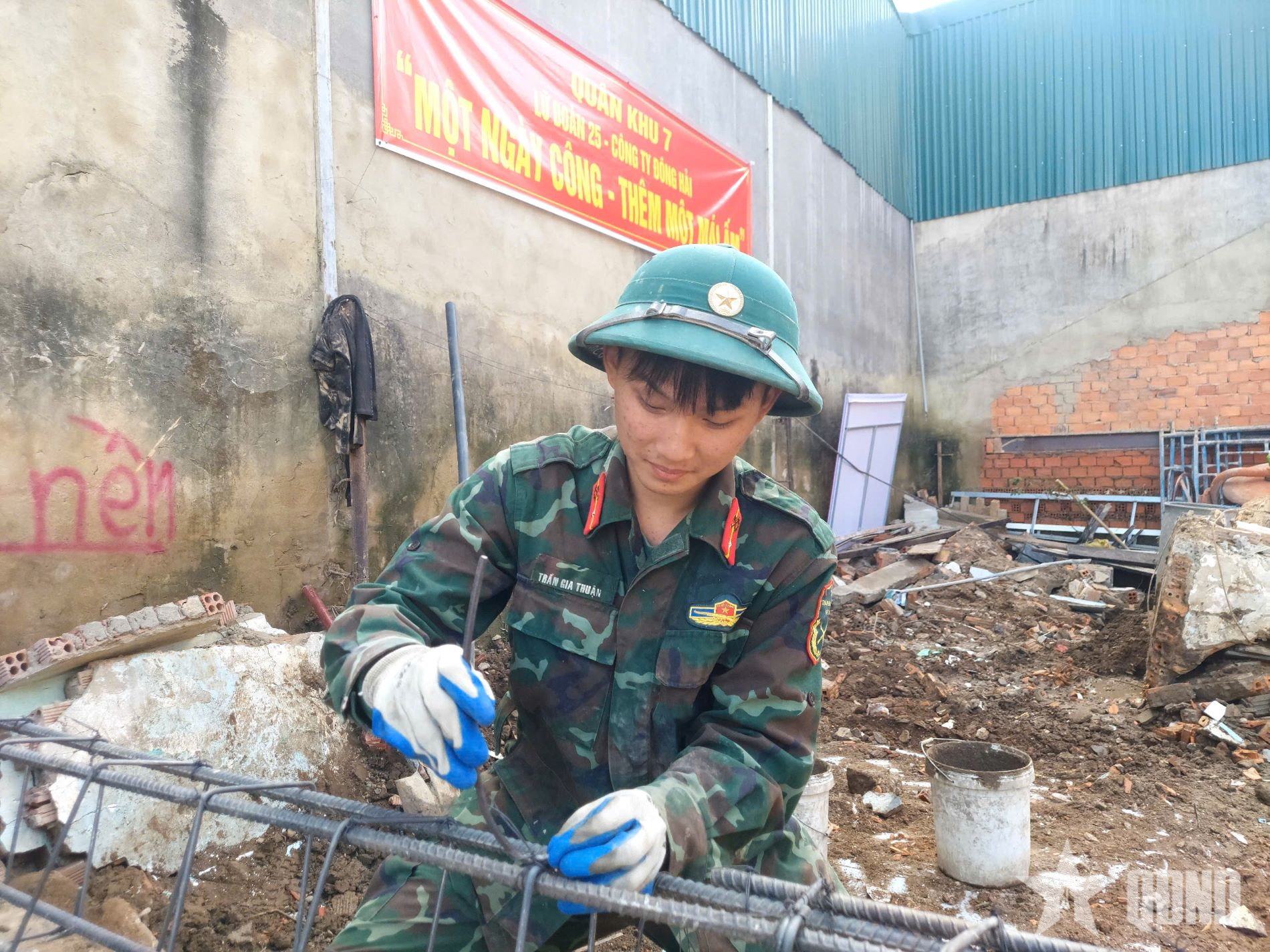 Tại công trình xây nhà cho gia đình anh Đỗ Bảo Nguyên, hàng chục cán bộ, chiến sĩ, công nhân của Lữ đoàn Công binh 25 và Công ty Đông Hải đang thi đua đẩy nhanh tiến độ, phấn đấu hoàn thành xây nhà trước thời gian quy định. Dõi theo từng viên gạch, bờ tường của ngôi nhà mới đang dần hoàn thiện, ánh mắt anh Đỗ Bảo Nguyên ánh lên niềm vui khó tả. “Anh em bộ đội xây nhà thiệt là nhanh, lại rất cẩn thận, chắc chắn, đẹp. Nhìn mọi người làm việc có lúc quên ăn, quên nghỉ, tôi rất cảm động. Ân tình này xin mãi khắc sâu, cảm ơn bộ đội rất nhiều”, anh Đỗ Bảo Nguyên xúc động nói.
