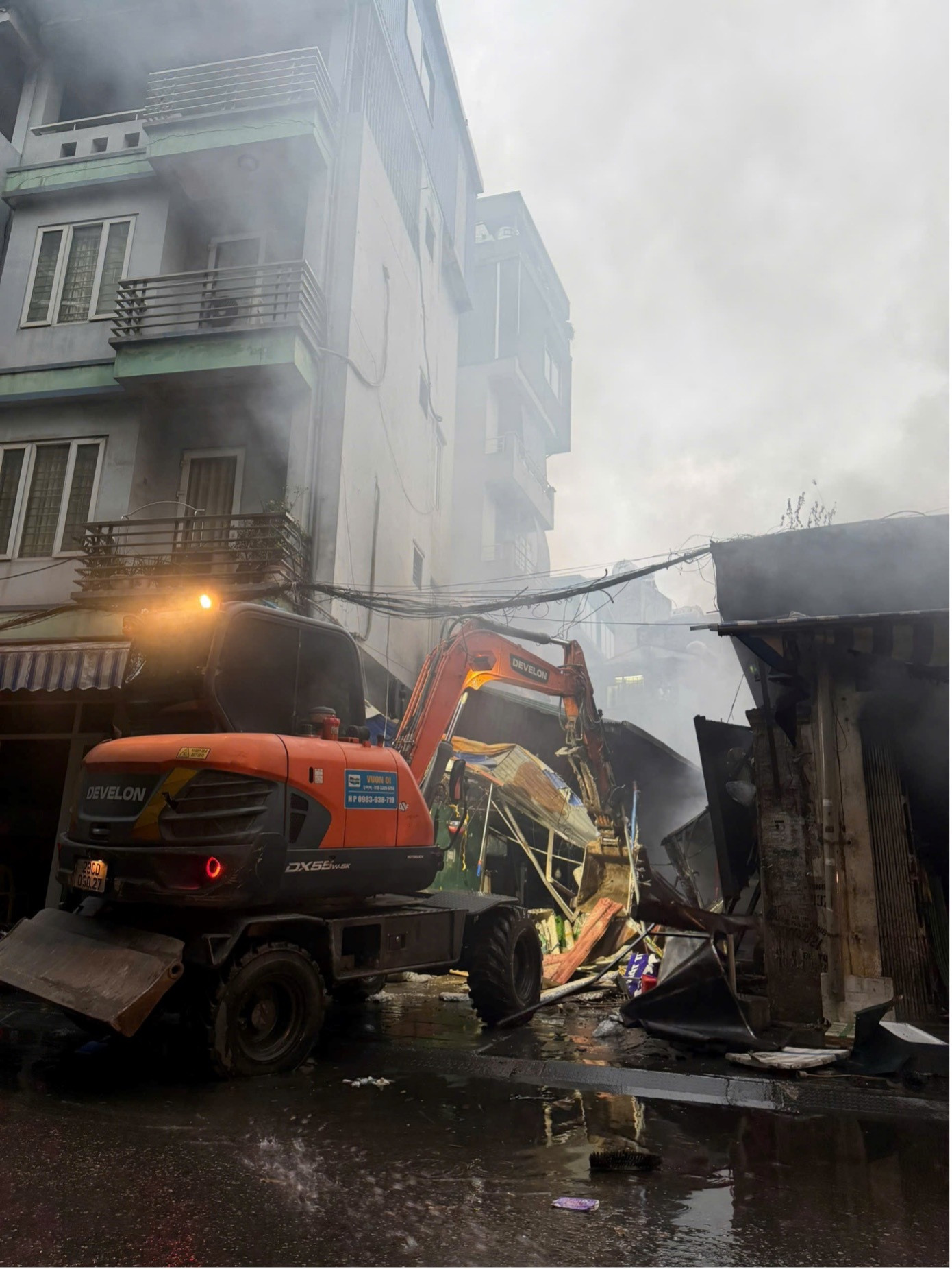 Đồng thời chính quyền địa phương huy động máy xúc phá dỡ cấu kiện sụp đổ, mở lối cho lực lượng Cảnh sát PCCC&CNCH tiếp cận tổ chức dập tắt đám cháy.
