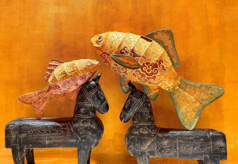 - Có những chiếc đèn tôi phục dựng nguyên mẫu. Nhưng có nhiều chiếc tôi đưa thêm yếu tố sáng tạo. Thí dụ như đèn cá chép, các cụ vẫn nói con cá chép gắn với tích “cá chép vượt vũ môn”. Nhưng con cá chép trong đèn xưa thì không có các nét vẽ thể hiện rõ ý nghĩa “vượt vũ môn”. Khi phục dựng chiếc đèn này, tôi nghĩ làm thế nào rõ nét ý nghĩa “vượt vũ môn”? Tôi đã đưa hoa văn của sóng nước trong trang trí mỹ thuật cổ truyền vào phần đuôi cá. Còn phần thân trên, có họa tiết trang trí mây. Trong các loại mây, tôi chọn hình ảnh mây của thời Trần. Hoa văn sóng nước thể hiện con cá vốn ở nước. Còn mây tượng trưng cho việc nó “lên trời”. Như thế, chiếc đèn vẫn mang chất văn hóa Việt, nhưng câu chuyện được “kể” để người xem, người chơi dễ hình dung hơn. Người ta cũng hiểu hơn về trang trí mỹ thuật truyền thống qua chiếc đèn.