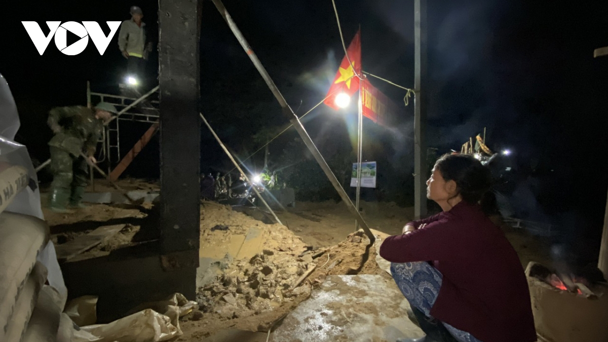 Trong đêm, ánh đèn công trường thắp lên niềm tin và hy vọng cho người dân sau quá nhiều mất mát. Bà Nguyễn Thị Thiểu, đội 3, thôn Phú Hữu, xã Hòa Thịnh, đang thức cùng bộ đội, chờ mong ngôi nhà mới dựng lại từ đổ nát.