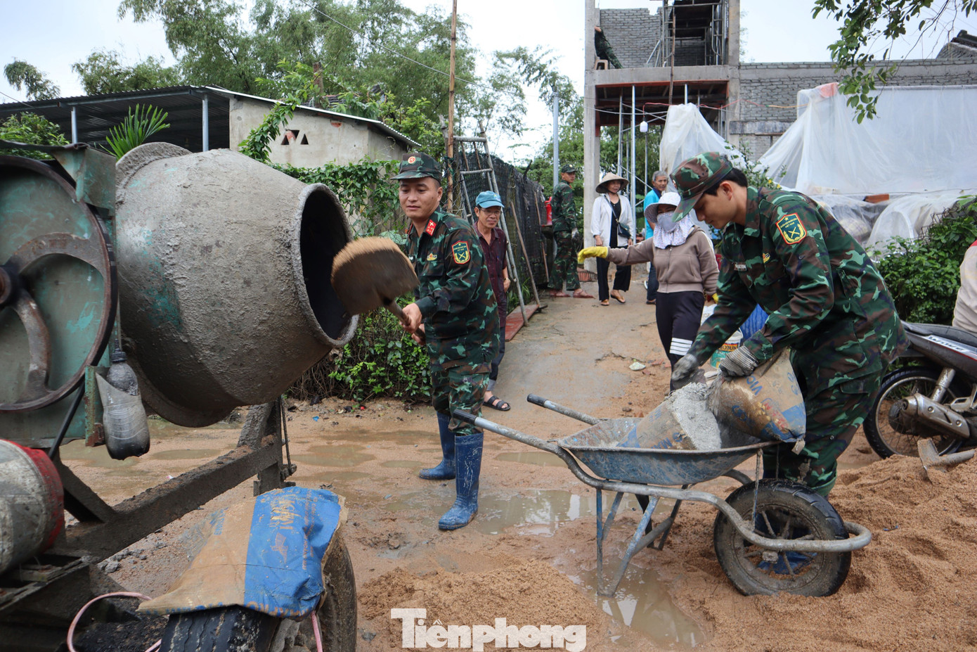 Cán bộ, chiến sĩ bộ đội tham gia dựng nhà cho người dân, bất chấp thời tiết mưa gió.