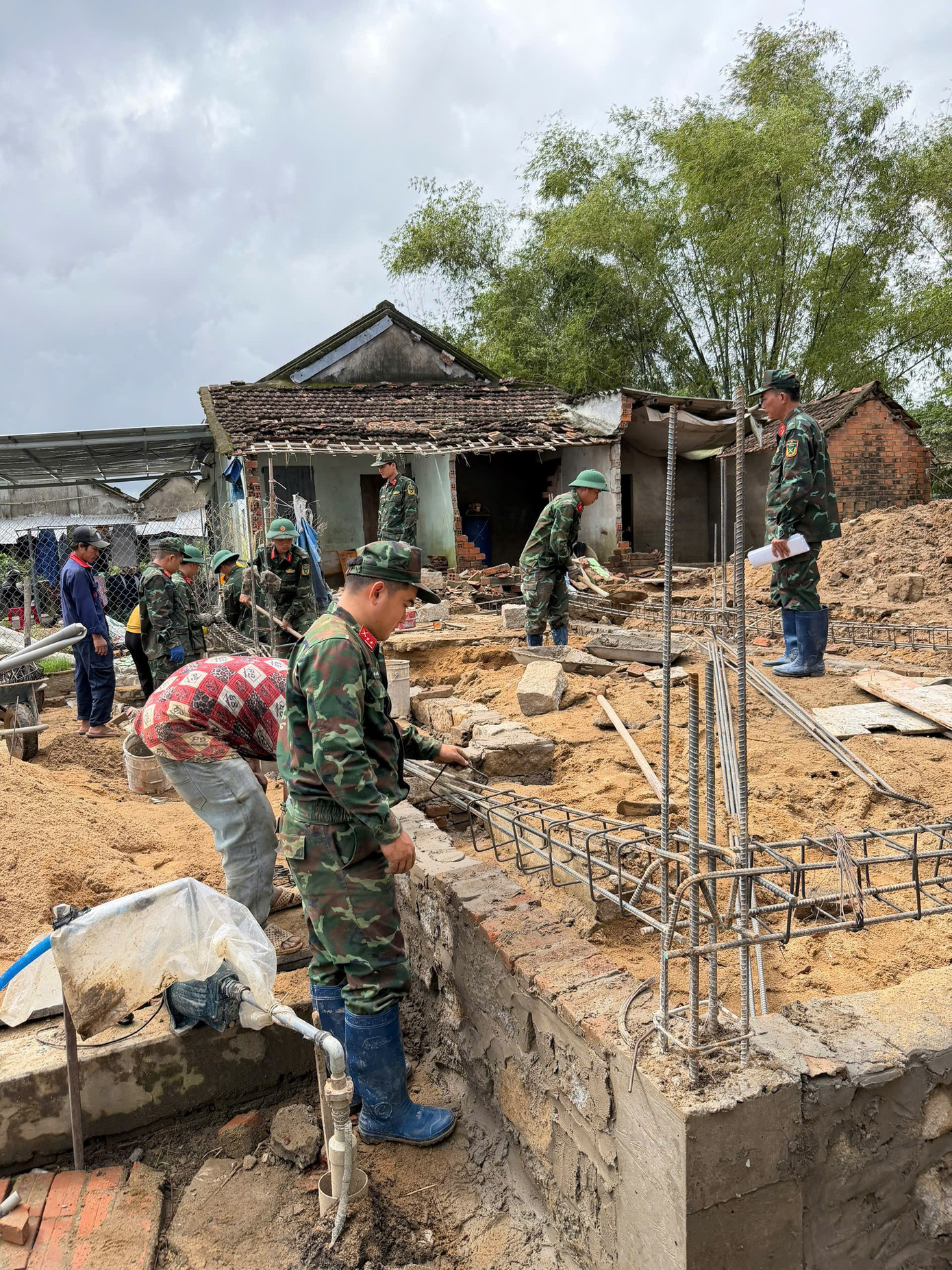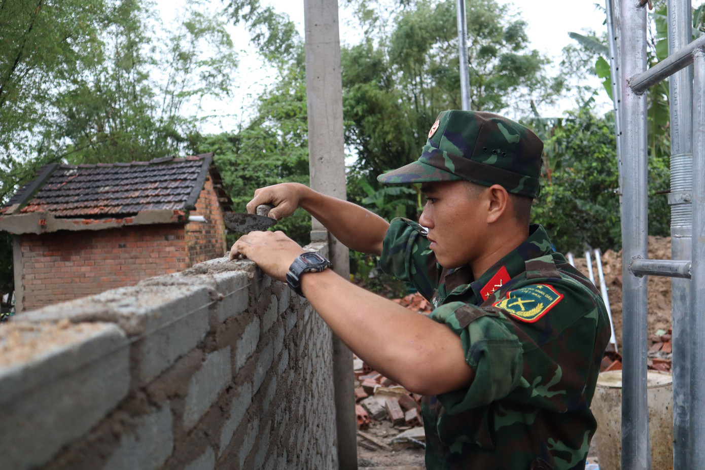 Cán bộ, chiến sĩ tham gia xây dựng lại nhà cho người dân.