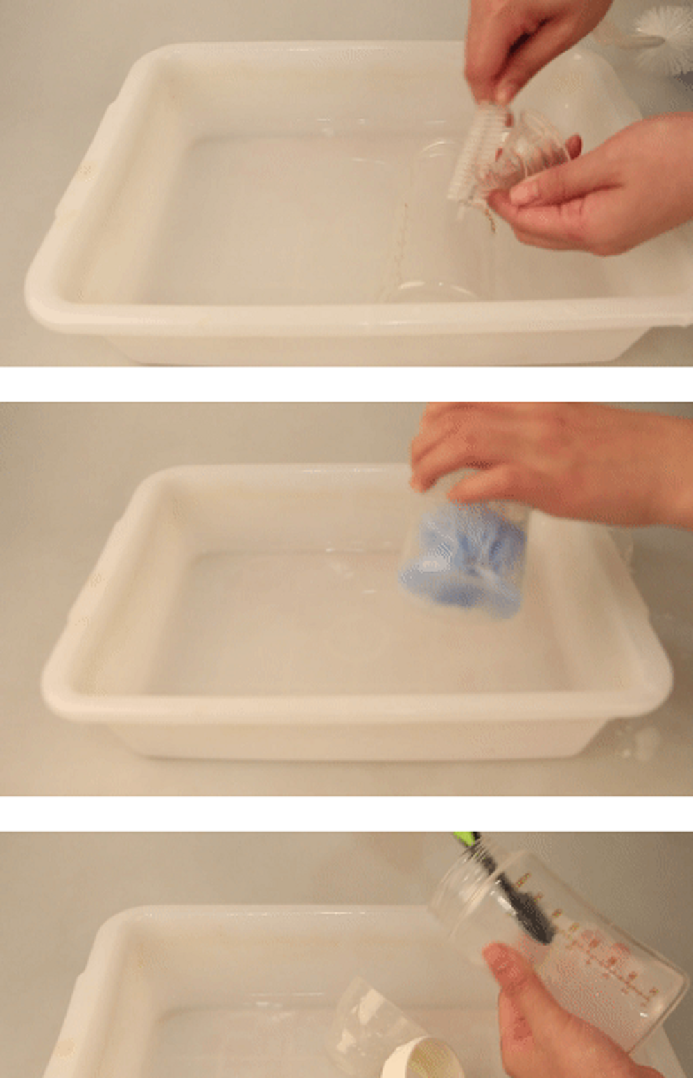 Tiếp đến, họ nên tháo rời bình sữa (bình, nắp, núm vú) và đặt vào nước, sau đó thêm dung dịch vệ sinh chuyên dụng (chất tẩy rửa không chứa chất bảo quản, chất diệt khuẩn hoặc hương liệu nhân tạo), dùng bàn chải nhỏ để làm sạch thành trong, thành ngoài, phần ren và nắp bình. Cuối cùng, rửa sạch các bộ phận này dưới vòi nước chảy, cả bên trong và bên ngoài.