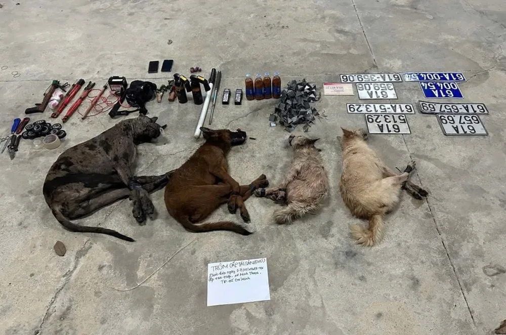 Tại hiện trường, lực lượng công an thu giữ một chiếc ô tô, bốn con chó và nhiều dụng cụ dùng để trộm chó như: súng bắn điện, bình xịt hơi cay, băng keo, các mảnh thép (dùng để thả xuống đường tránh sự truy đuổi), nhiều biển số xe, bột ớt…
