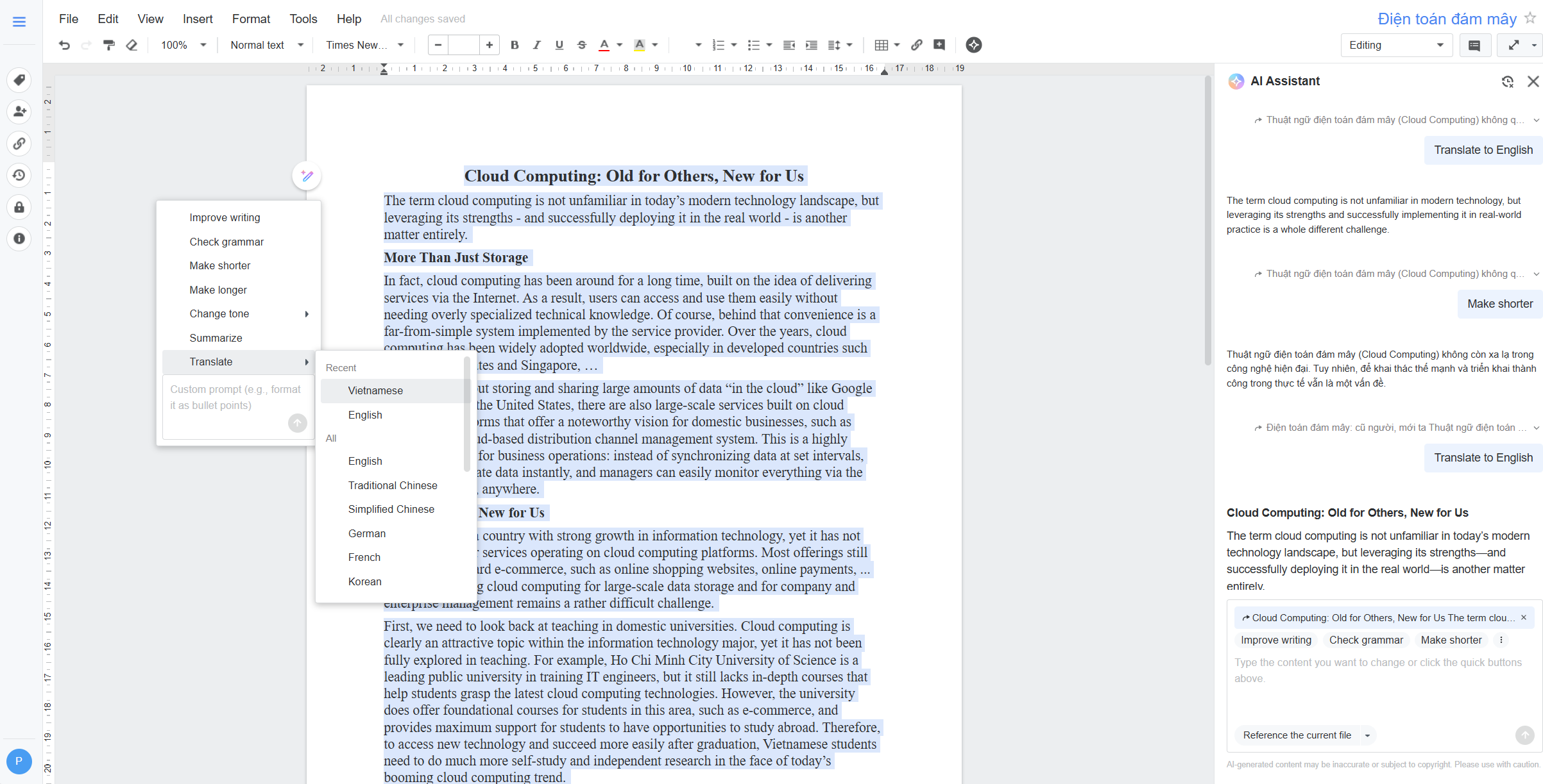 Một tính năng khác mang tính thực dụng hơn là chỉnh sửa ngôn ngữ và giọng văn. AI có thể chuyển một đoạn viết mang tính cá nhân sang văn phong trung tính, phù hợp báo cáo doanh nghiệp; hoặc làm ngược lại để nội dung trở nên thân thiện, gần gũi hơn. Qua các trải nghiệm thực tế, gợi ý chỉnh sửa khá “vừa tay”, không quá máy móc, dù đôi lúc vẫn cần người dùng đọc lại để tinh chỉnh cho phù hợp bối cảnh.