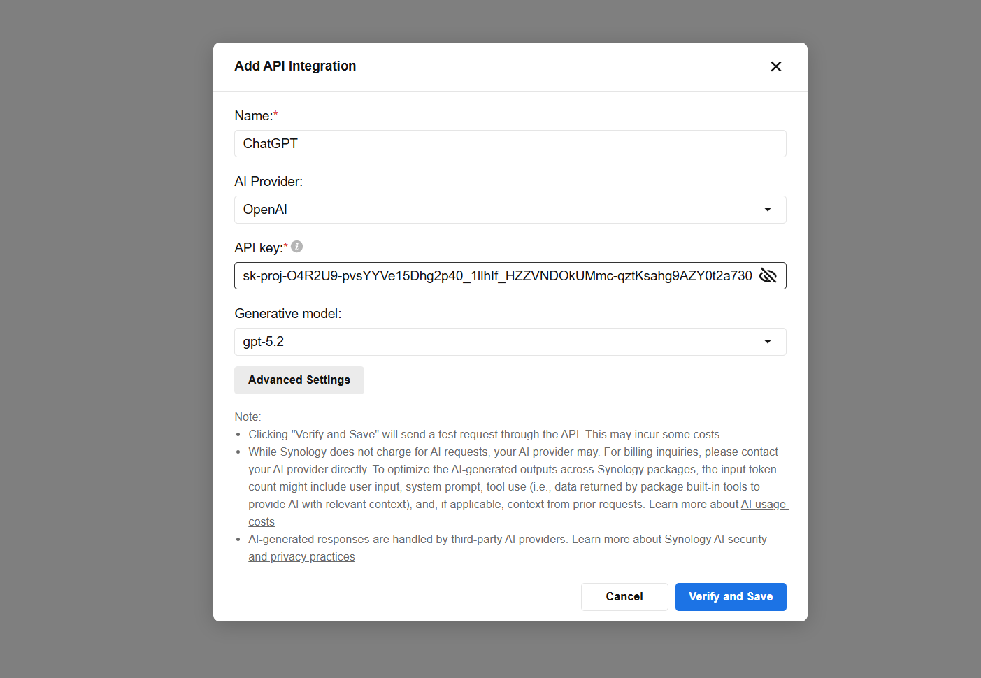 Chẳng hạn với OpenAI, trước tiên người dùng sẽ tạo API token tại địa chỉ https://platform.openai.com/api-keys. Sau đó, trong giao diện quản trị DSM của hệ thống Synology NAS (ví dụ: DS925 ), truy cập Synology AI Console > chọn OpenAI > dán API key vào và hoàn tất cấu hình > chọn áp dụng cho Synology Office.
