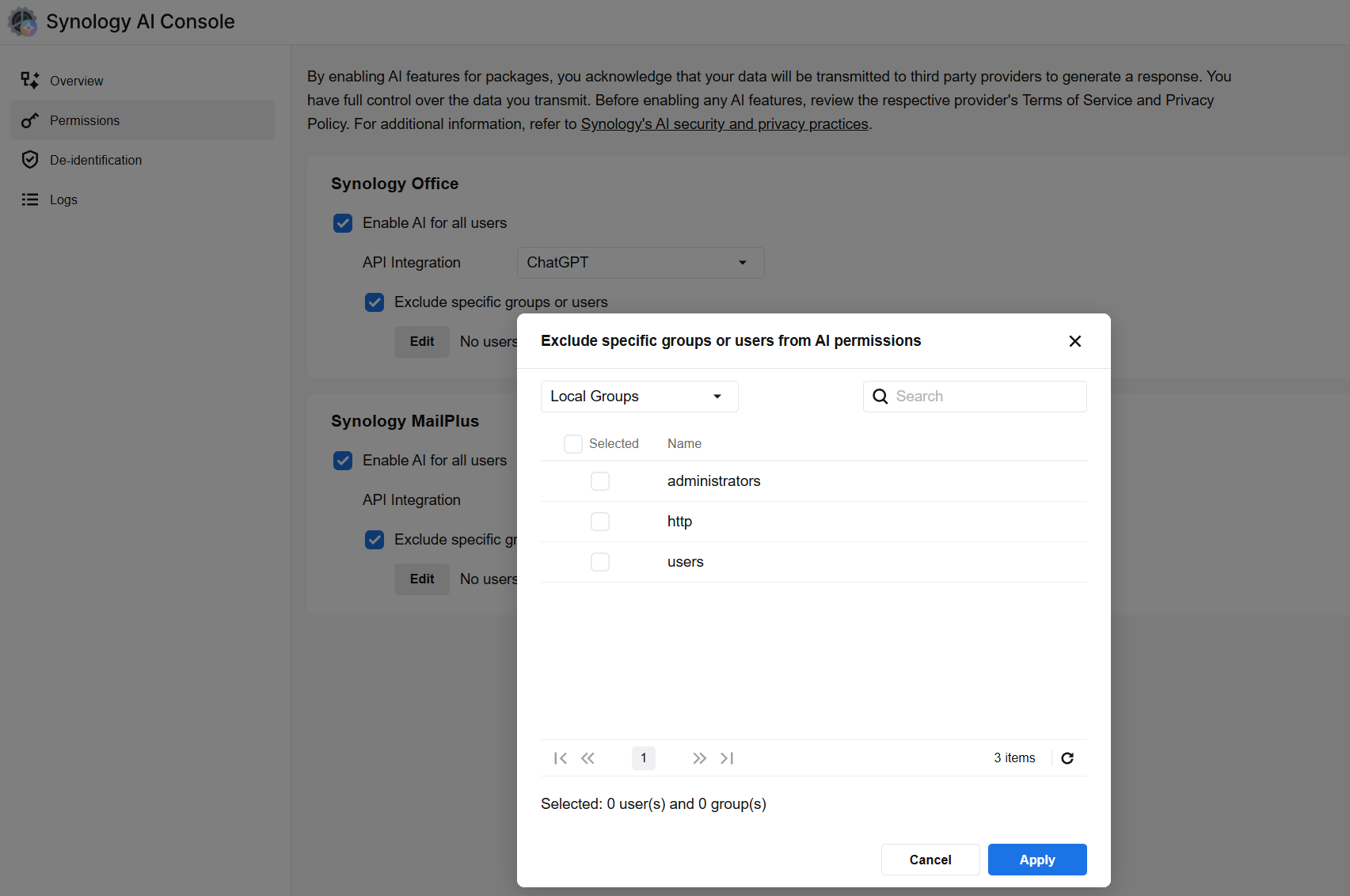 Synology cũng nhấn mạnh nguyên tắc không dùng dữ liệu của người dùng để đào tạo mô hình AI bên ngoài: Toàn bộ dữ liệu được lưu trữ trên NAS, không bị các nền tảng AI tận dụng cho mục đích huấn luyện. Hơn nữa, hệ thống phân quyền tập trung cho phép kiểm soát ai được sử dụng AI và ở mức độ nào.