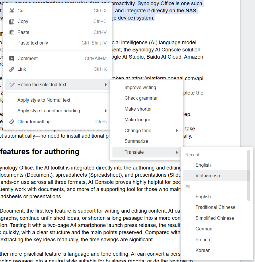 Trong Synology Office, bộ công cụ AI được tích hợp trực tiếp vào quá trình soạn thảo và chỉnh sửa tài liệu (Document), bảng tính (Spreadsheet) và bài trình chiếu (Slides). Qua thực tế trải nghiệm trên cả ba dạng tài liệu, có thể thấy AI Console hỗ trợ đắc lực cho người thường xuyên phải làm việc với tài liệu, và sẽ chỉ là phụ trợ cho người cần xử lý bảng tính hay trình chiếu.