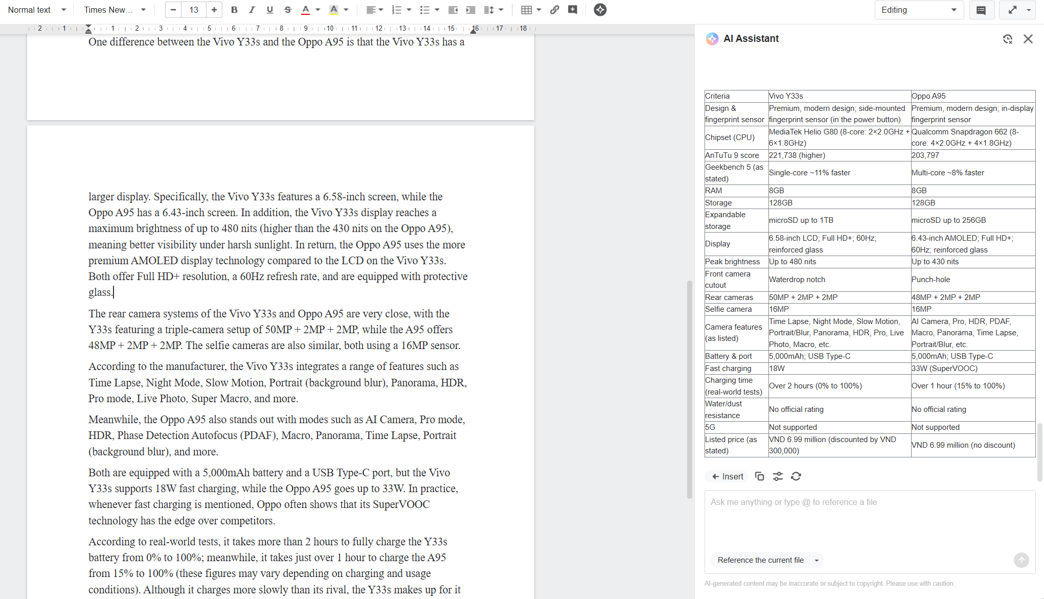 Đối với Document, tính năng quan trọng đầu tiên là hỗ trợ viết và chỉnh sửa nội dung. AI có thể gợi ý đoạn văn, viết tiếp ý còn dang dở hoặc rút gọn một đoạn dài thành phiên bản súc tích hơn. Dùng thử với thông cáo báo chí ra mắt smartphone dài 2 trang A4, kết quả trả về nhanh, bố cục rõ ràng, giữ được các ý chính. So với việc tự đọc và chắt lọc, thời gian tiết kiệm đáng kể.