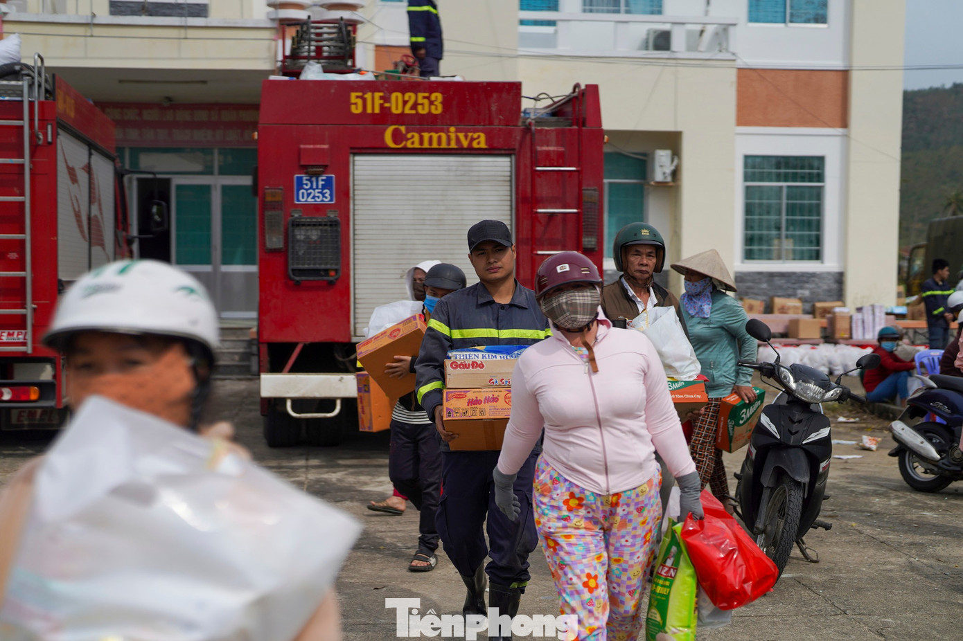 Một tổ xe cứu hỏa dừng tại trụ sở xã Xuân Phương cũ (nay là phường Sông Cầu, tỉnh Đắk Lắk) đưa nhu yếu phẩm phát cho người dân.