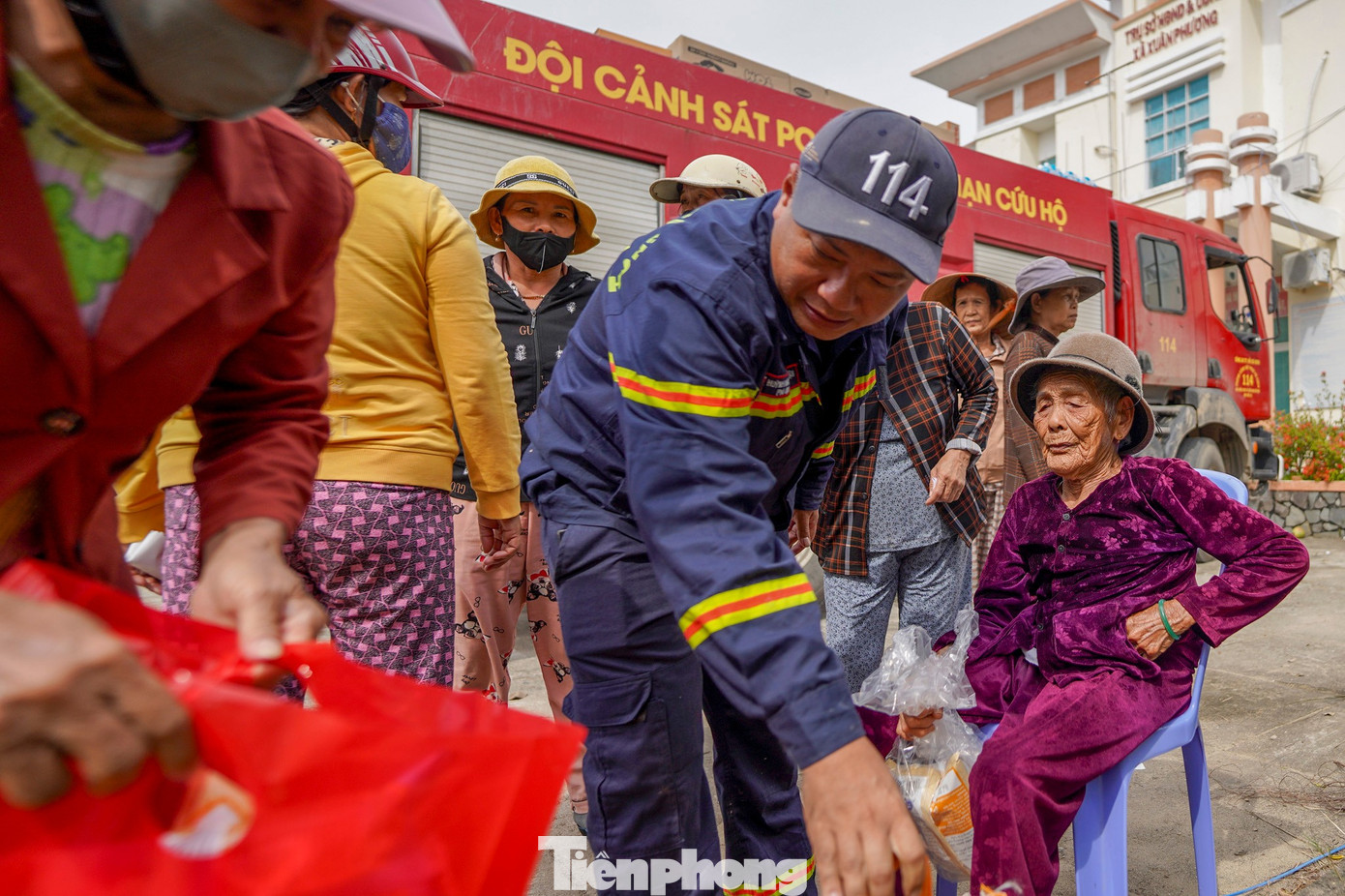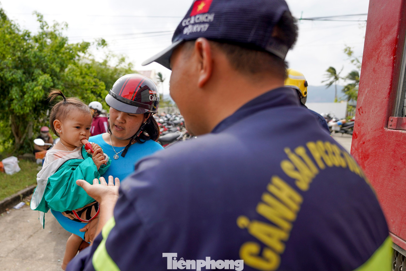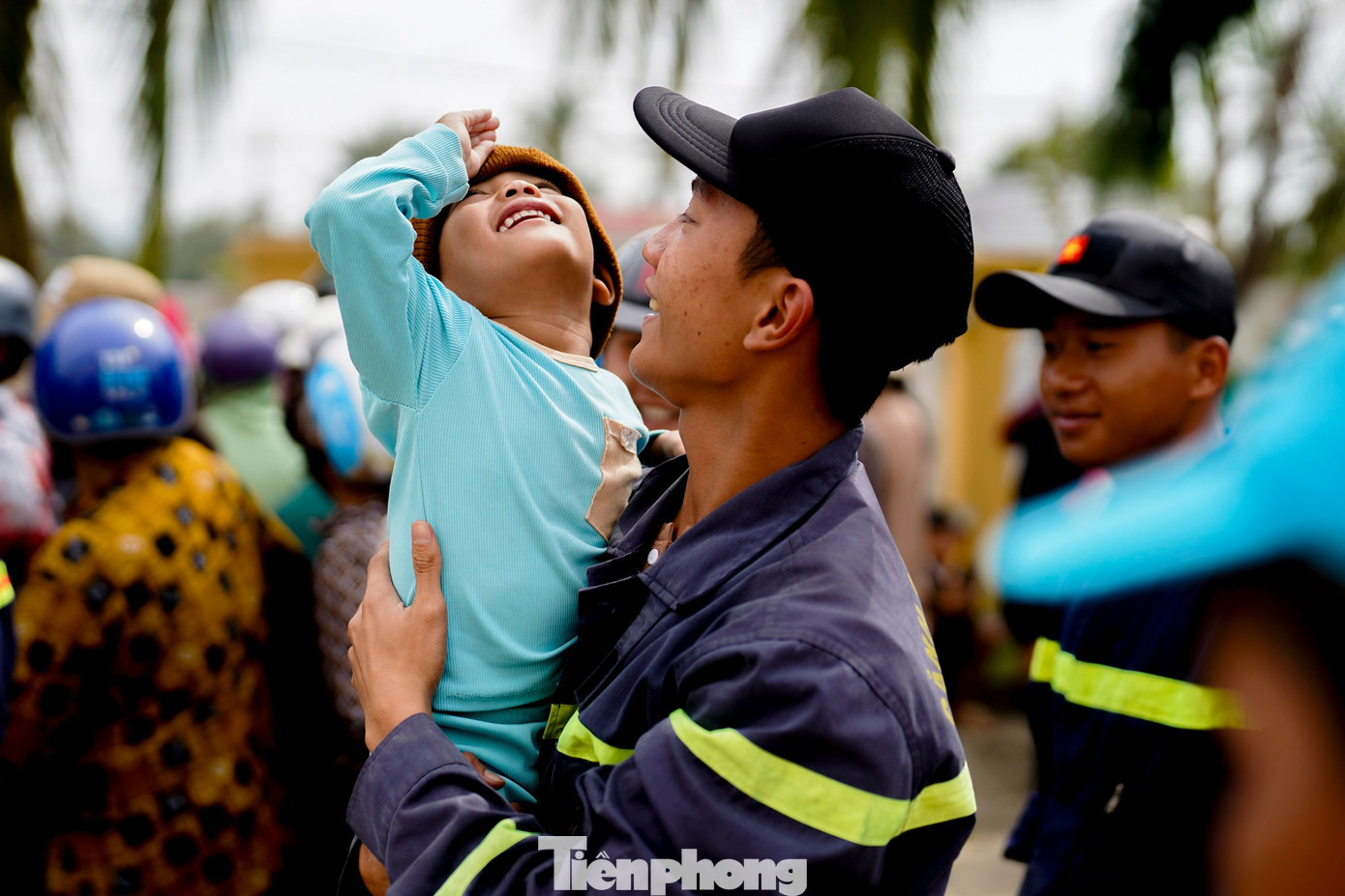 Khoảnh khắc chiến sĩ phòng cháy chữa cháy giữ con cho người dân vào nhận quà cứu trợ.