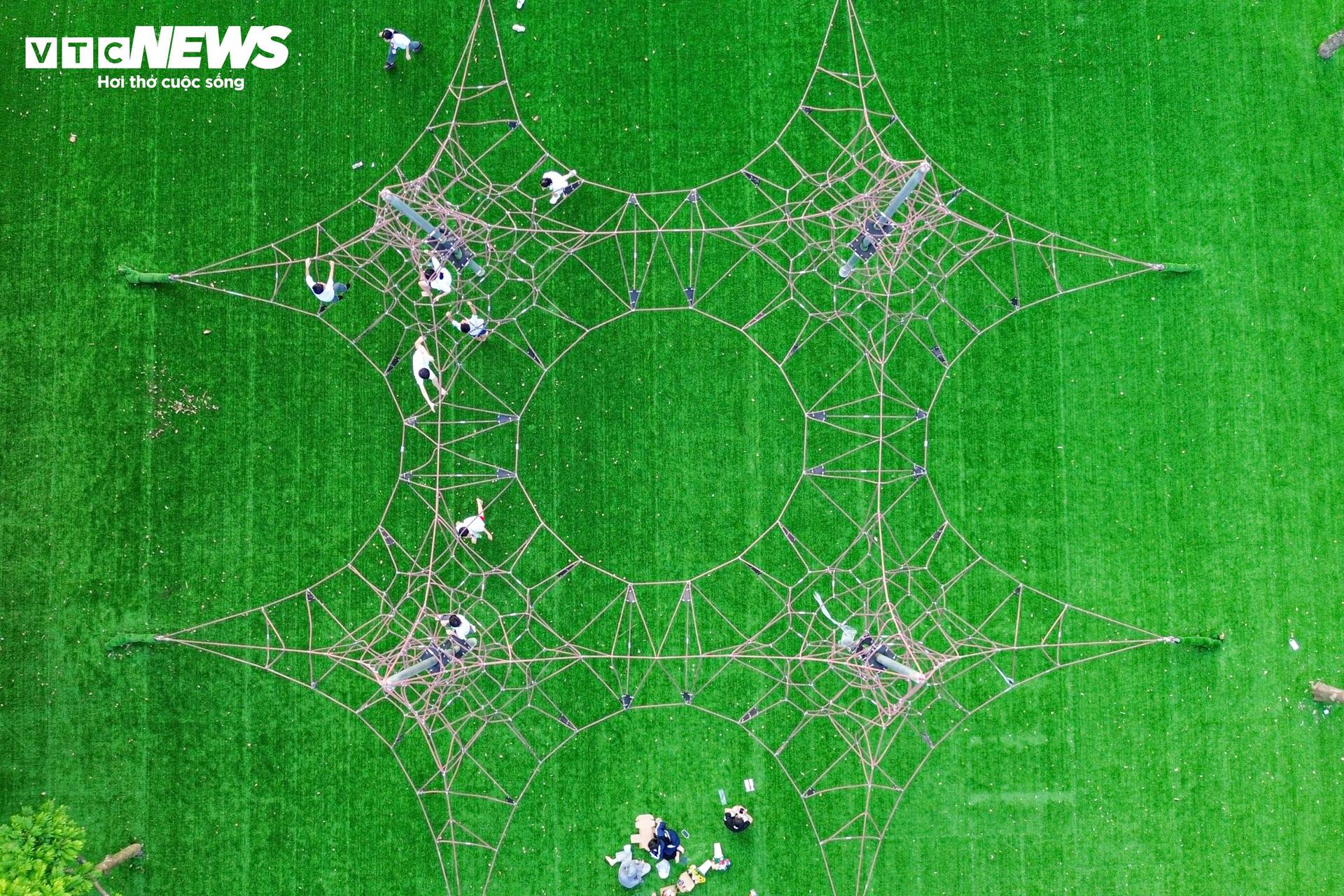Toàn bộ khu vui chơi cũ được thay thế bằng hệ thống thiết bị liên hoàn hiện đại gồm cầu trượt, xích đu, lưới nhện, nhà bóng và nhiều bộ vận động đa năng, mang đến trải nghiệm phong phú cho trẻ em.
