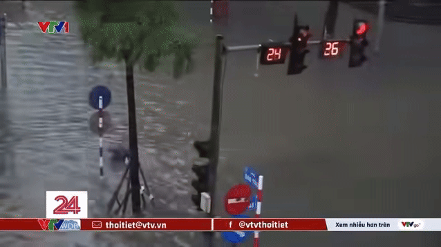 Cô gái trẻ liên tục bị ngã do đường ngập sâu. Ảnh cắt từ clip/Nguồn: VTV 24