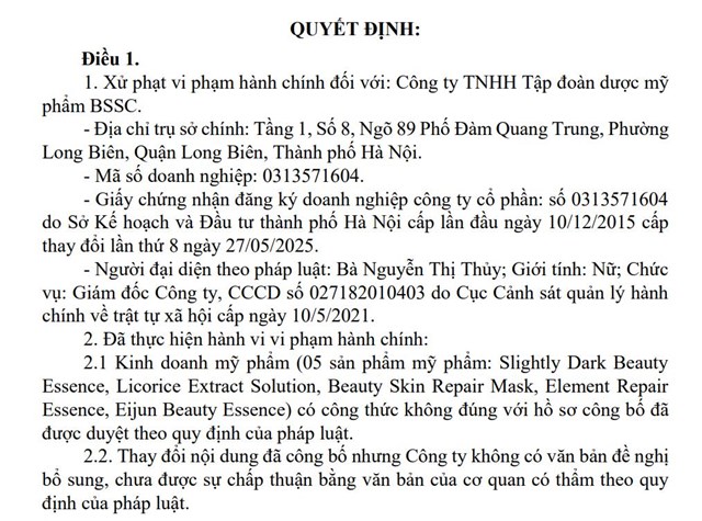Cụ thể, Dược mỹ phẩm BSSC bị xử phạt do kinh doanh 5 sản phẩm mỹ phẩm gồm: Slightly Dark Beauty Essence, Eijun Beauty Essence, Element Repair Essence, Licorice Extract Solution, Beauty Skin Repair Mask có công thức không đúng với hồ sơ công bố đã được duyệt theo quy định pháp luật; Tự ý thay đổi nội dung công bố sản phẩm mà không có văn bản đề nghị bổ sung hoặc được sự chấp thuận của cơ quan quản lý.