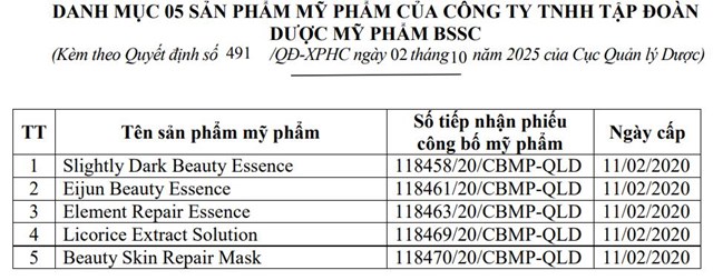 Trước đó, tháng 8/2025, Cục Quản lý Dược cũng đã đình chỉ lưu hành và thu hồi trên toàn quốc 5 sản phẩm mỹ phẩm của Dược mỹ phẩm BSSC do có công thức không đúng với hồ sơ đã công bố. Các sản phẩm bị thu hồi gồm: Slightly Dark Beauty Essence, Eijun Beauty Essence, Element Repair Essence, Licorice Extract Solution và Beauty Skin Repair Mask.