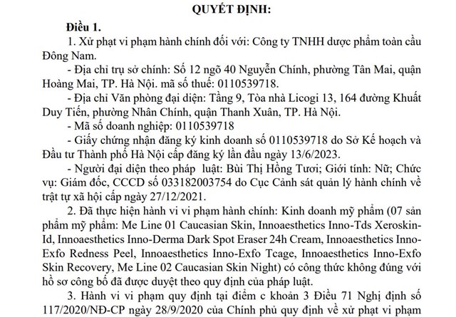 Theo đó, Dược phẩm Toàn cầu Đông Nam đã kinh doanh 7 sản phẩm mỹ phẩm có công thức không đúng với hồ sơ công bố đã được duyệt theo quy định của pháp luật. 7 sản phẩm mỹ phẩm gồm: Me Line 01 Caucasian Skin, Innoaesthetics Inno-Tds XeroskinId, Innoaesthetics Inno-Derma Dark Spot Eraser 24h Cream, Innoaesthetics InnoExfo Redness Peel, Innoaesthetics Inno-Exfo Tcage, Innoaesthetics Inno-Exfo Skin Recovery, Me Line 02 Caucasian Skin Night.