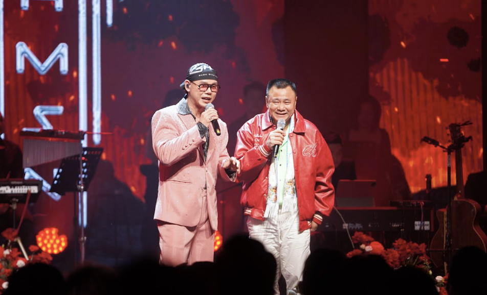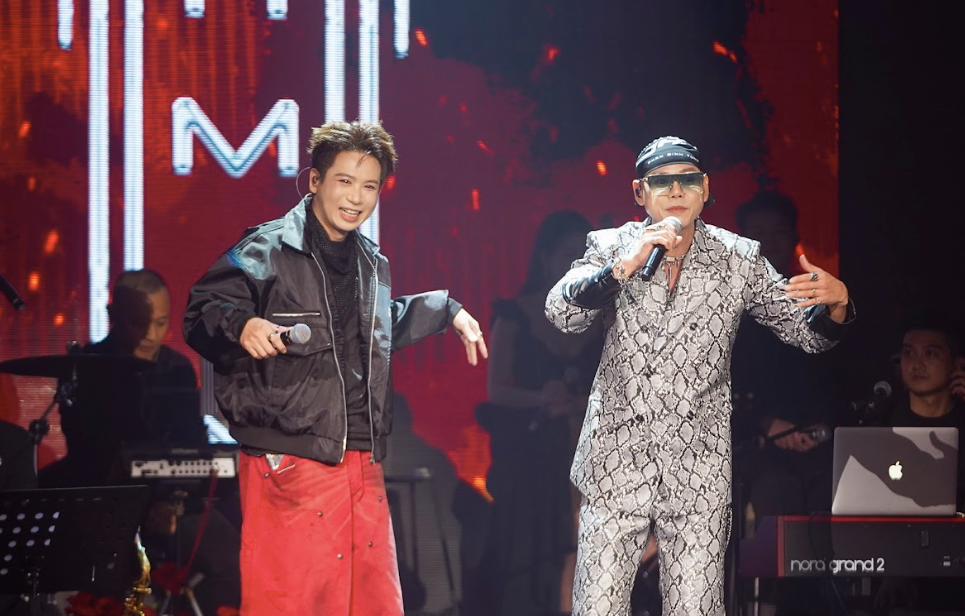 Phan Đinh Tùng và NSND Tự Long trên sân khấu.