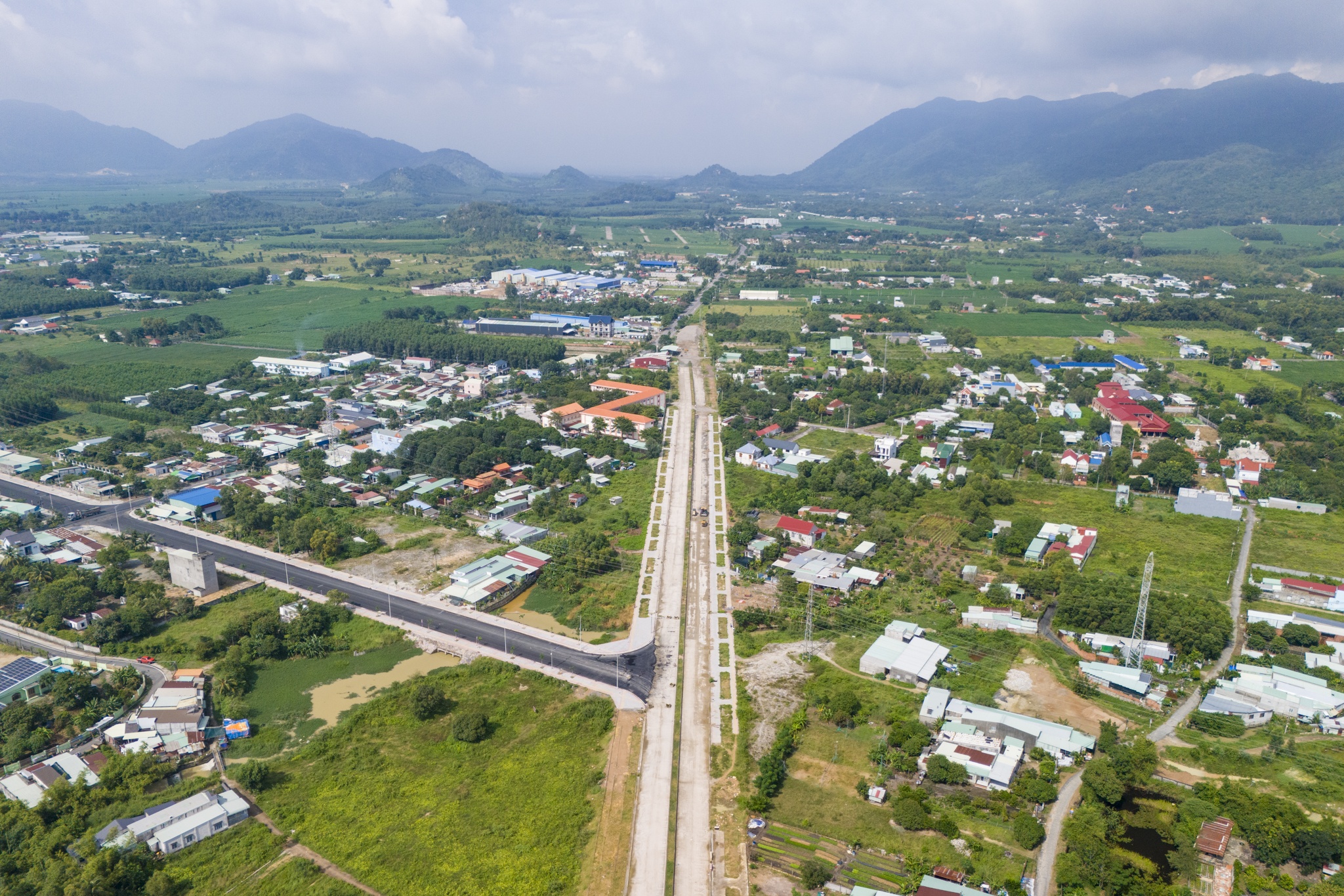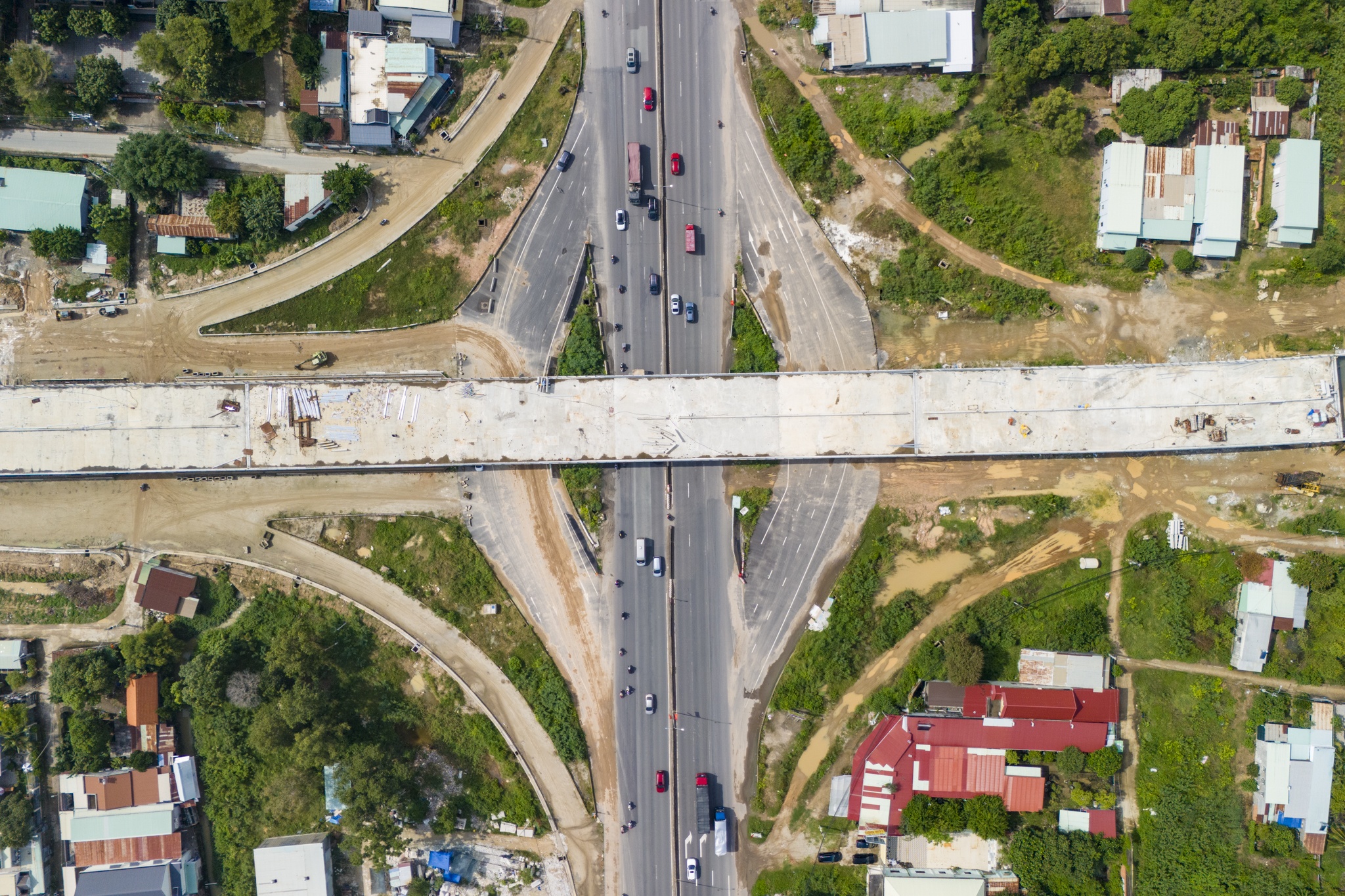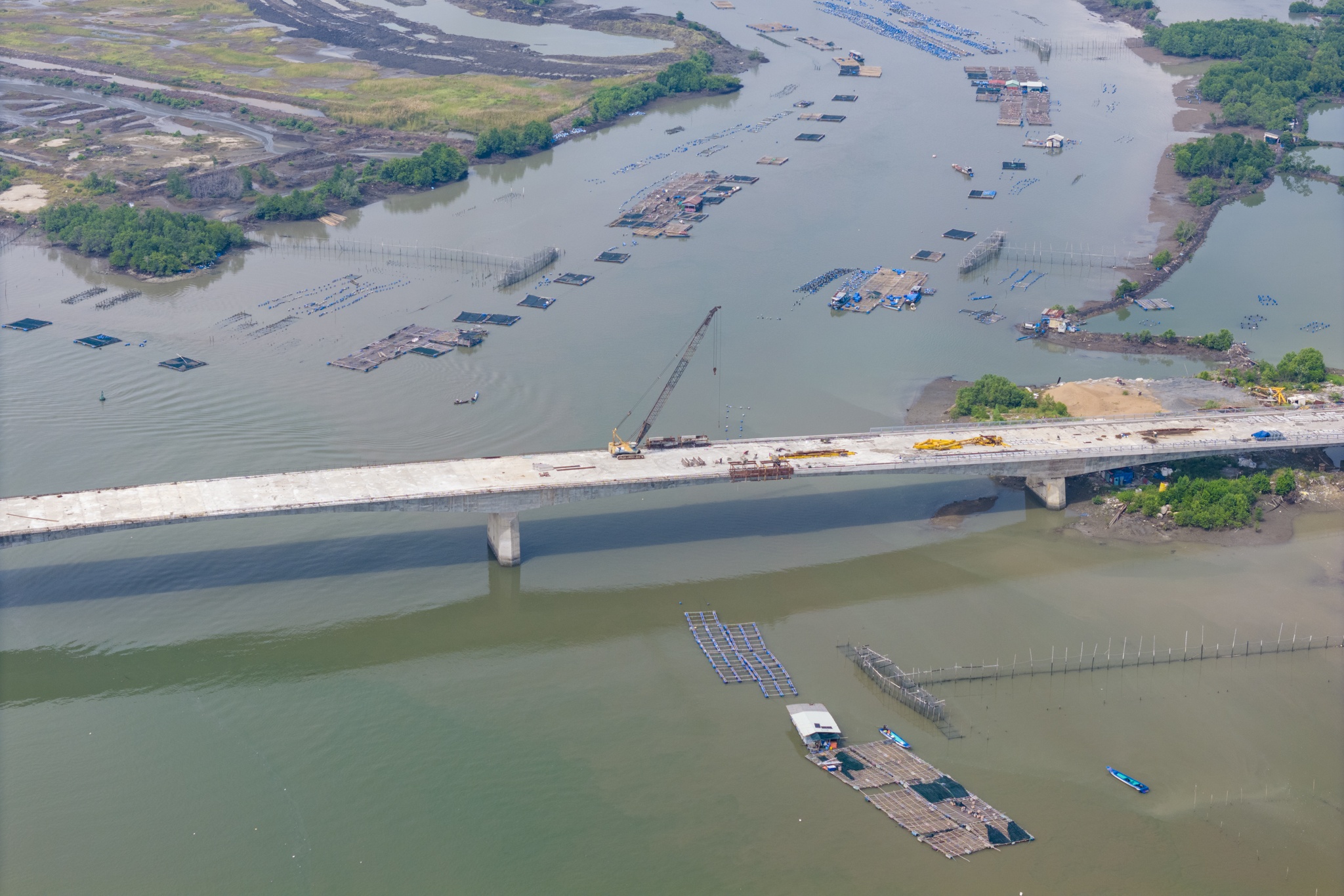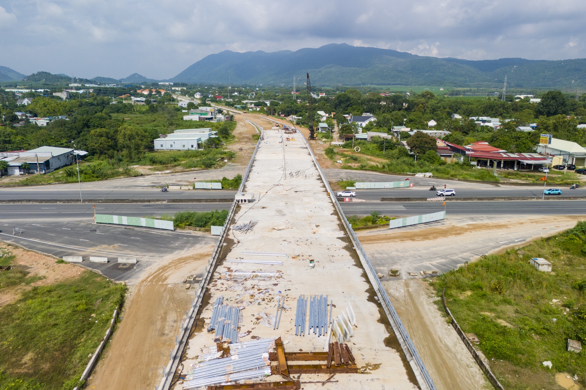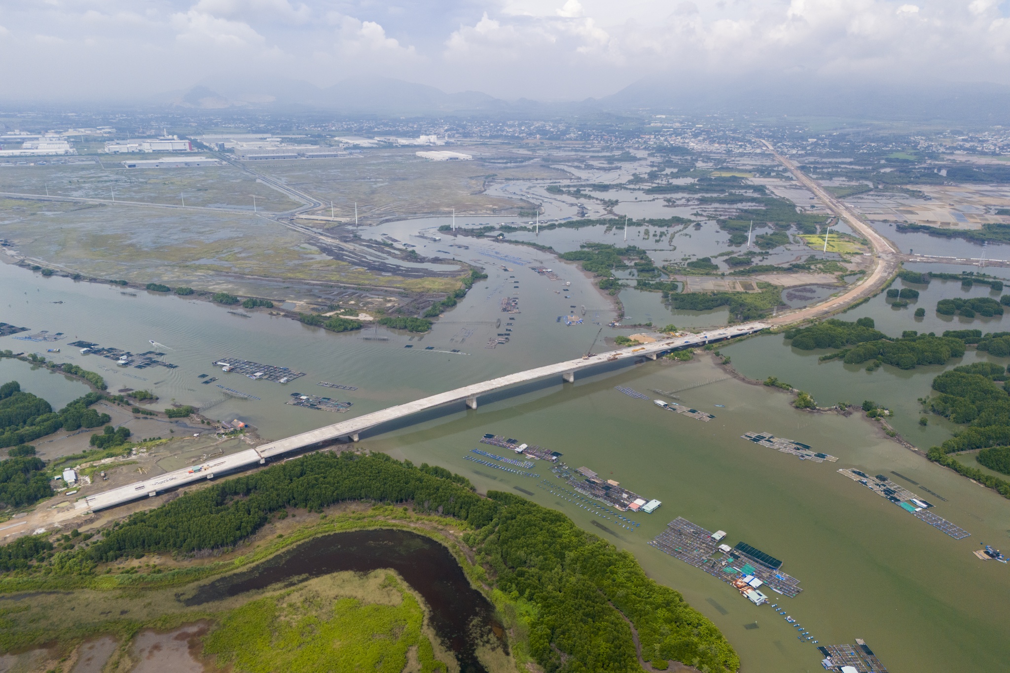 Trong ảnh là nút giao giữa tuyến chính của dự án đường liên cảng Cái Mép - Thị Vải và Quốc lộ 51. Cầu vượt tại nút giao đã hoàn thiện phần kết cấu bê tông, các hạng mục lan can và dải phân cách đang được lắp đặt.