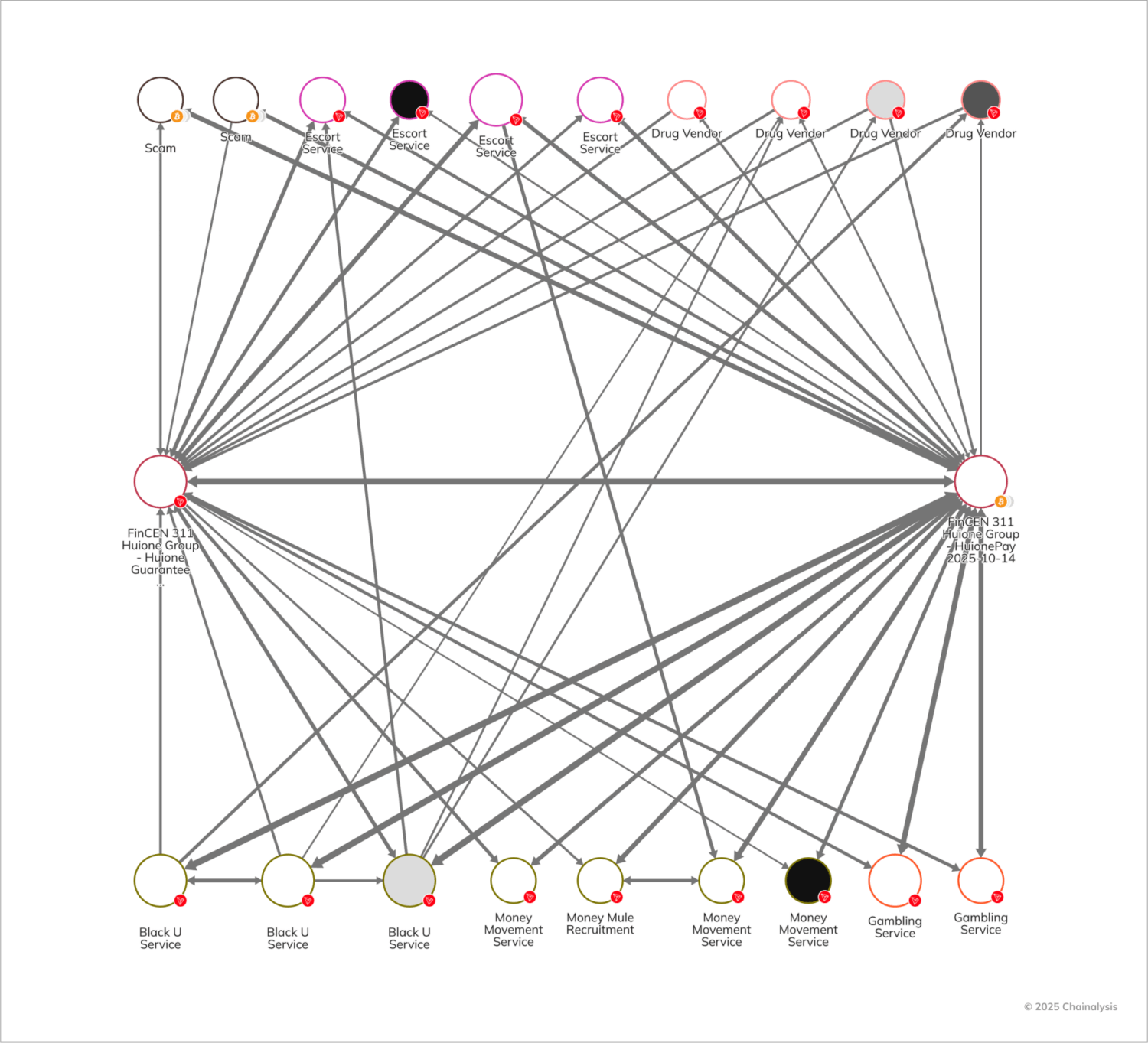 Sơ đồ mô phỏng cách các quỹ bất hợp pháp di chuyển giữa các ví, dịch vụ và tổ chức khác nhau trong mạng lưới rửa tiền quốc tế, bao gồm cả những tổ chức bị Mỹ trừng phạt theo mục 311 của FinCEN.
