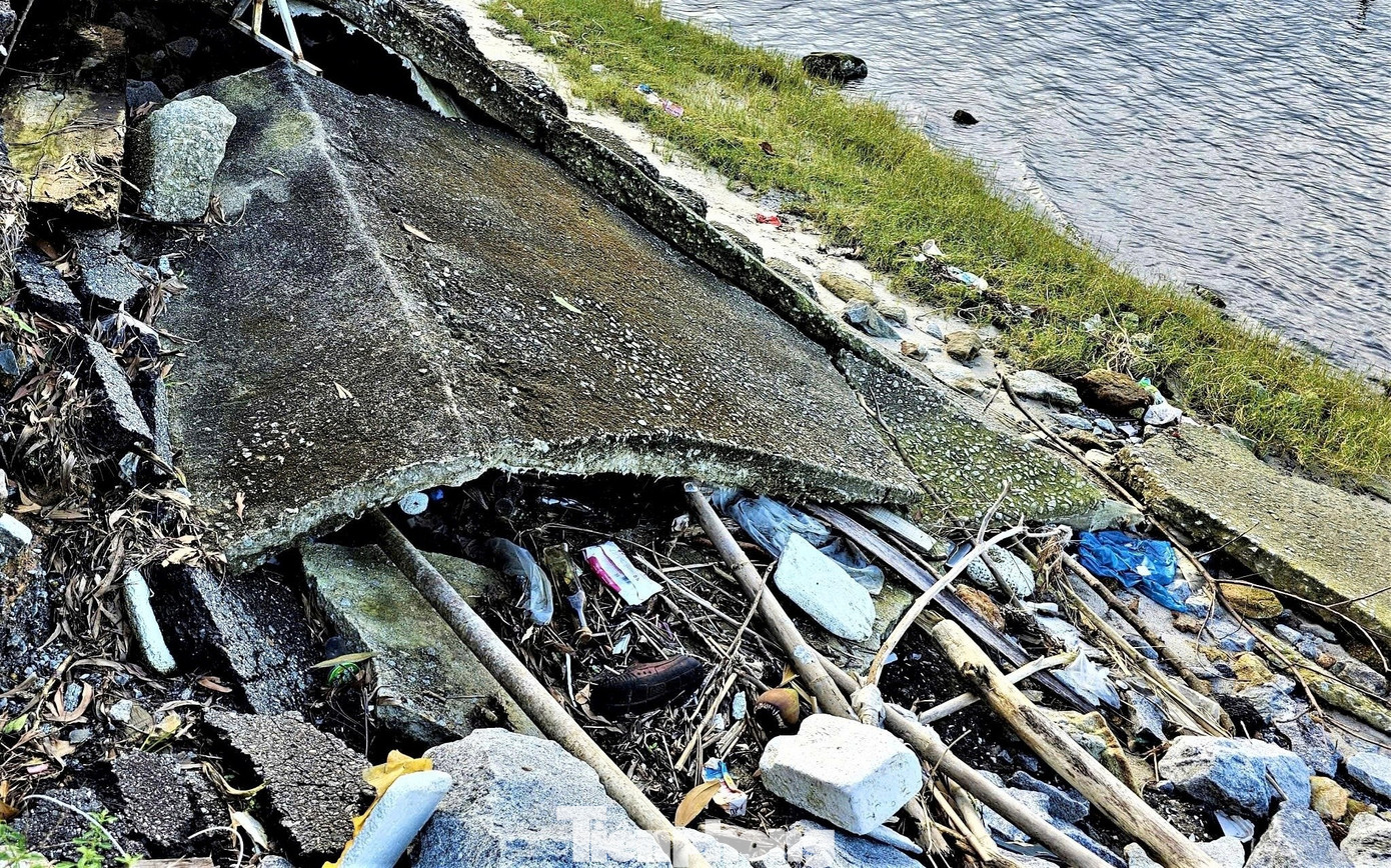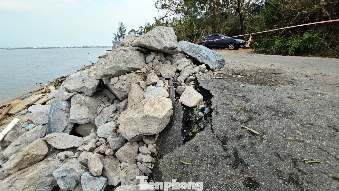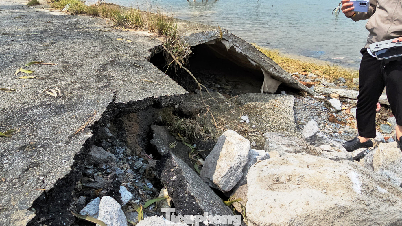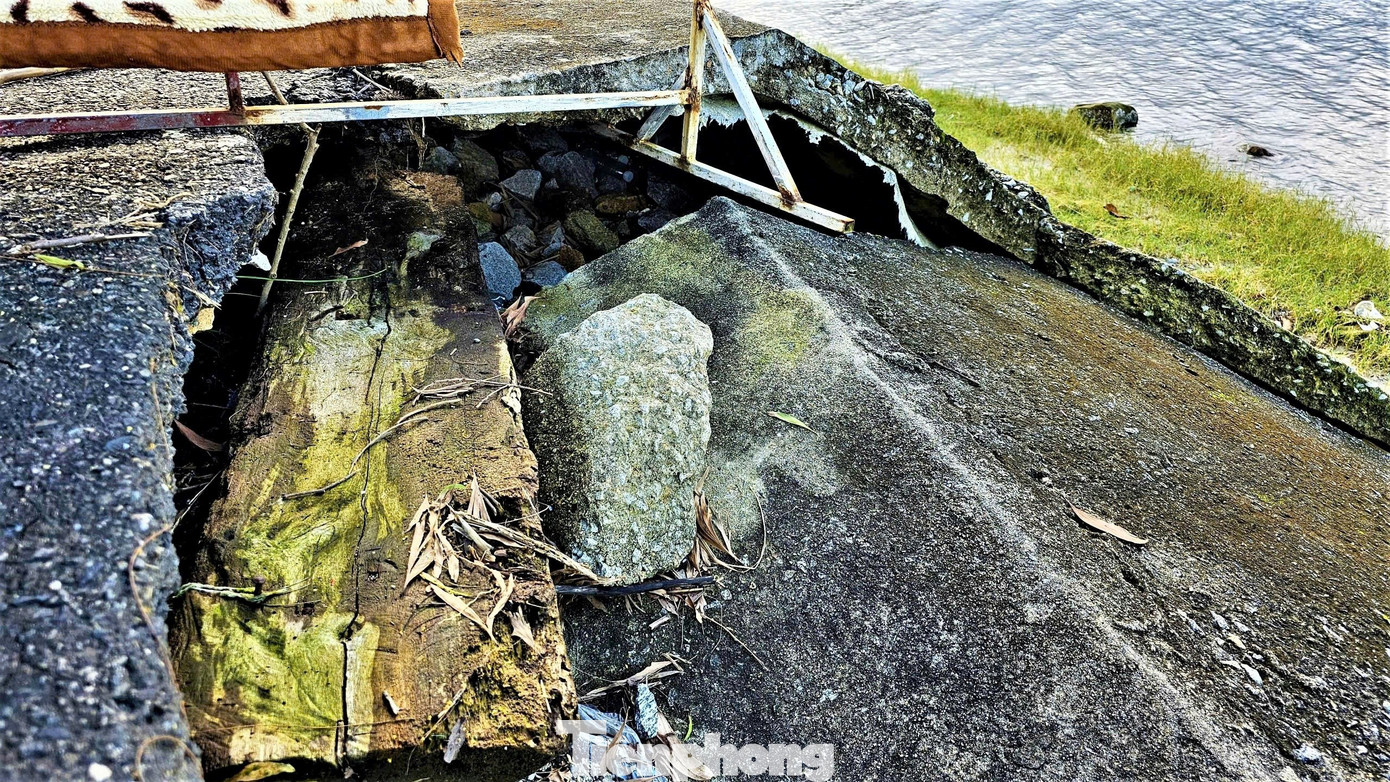Mặt đường bê tông nhựa bị nứt gãy, mái bê tông xi măng gia cố móng đường ven đầm bị sụp đổ… khiến việc lưu thông gặp nhiều khó khăn, nguy hiểm.