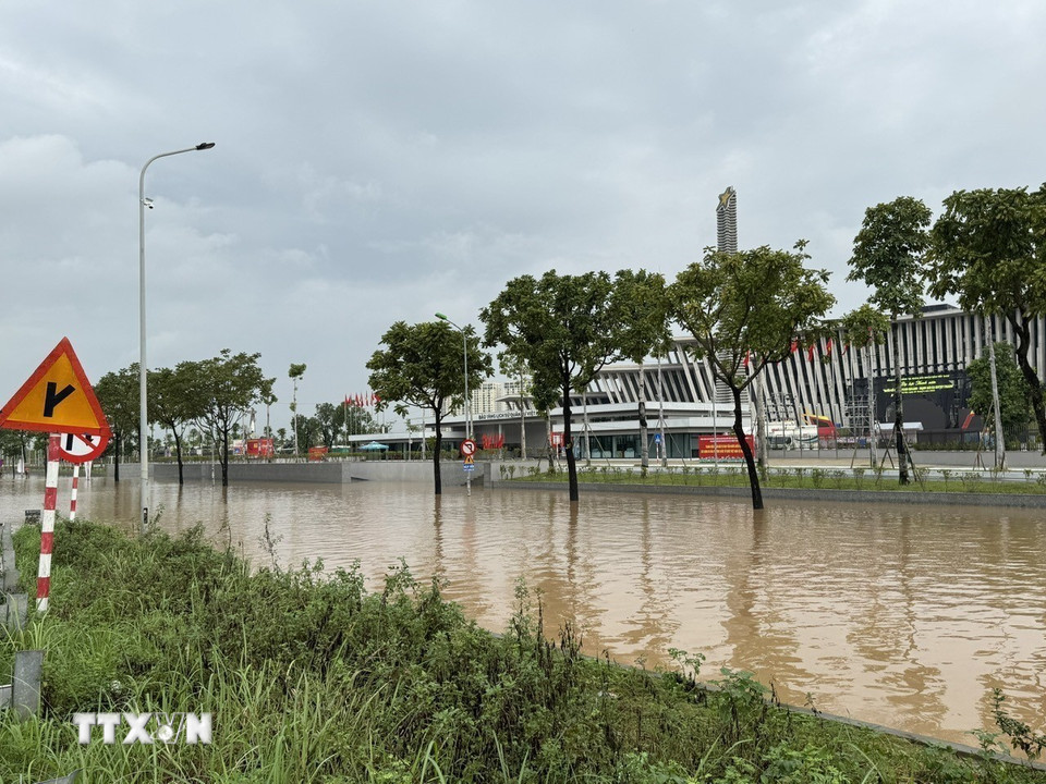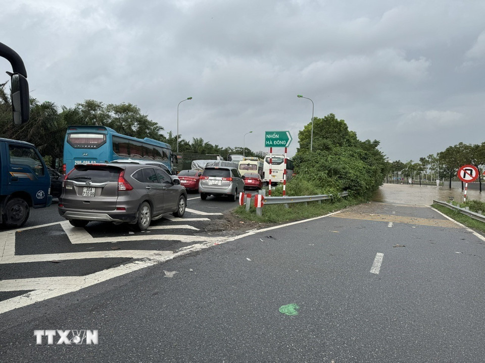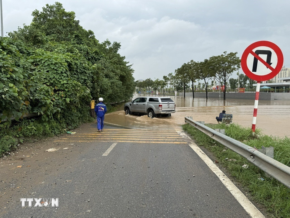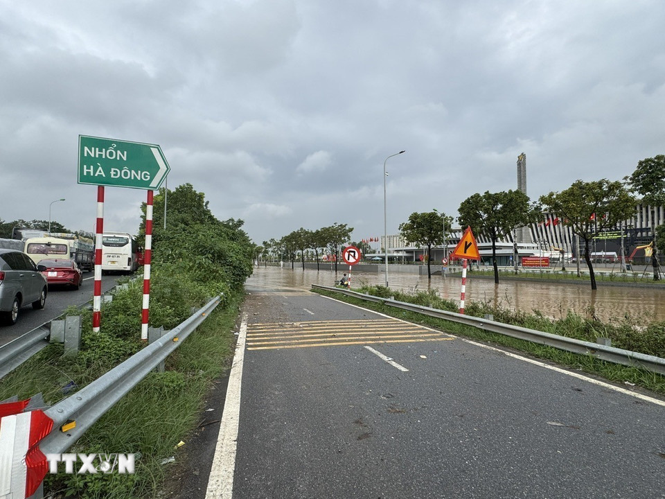 Đường gom Đại lộ Thăng Long bị ngập sâu. (Ảnh: Quốc Lũy/TTXVN)