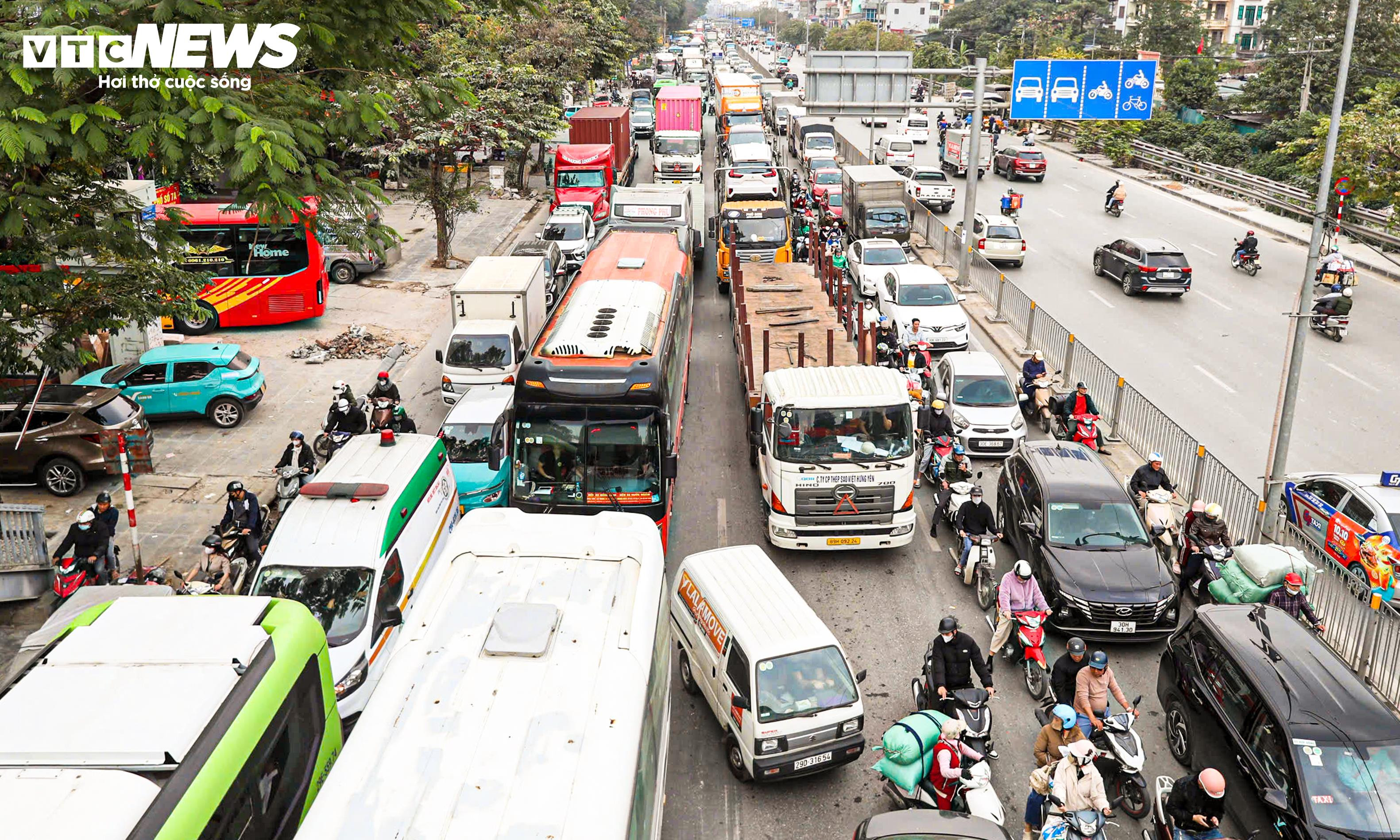 Lượng phương tiện tăng đột biến khiến nhiều tuyến phố ùn ứ nghiêm trọng. (Hình ảnh tại đường Ngọc Hồi, đoạn gần bến xe Nước Ngầm lúc 16h ngày 31/12).